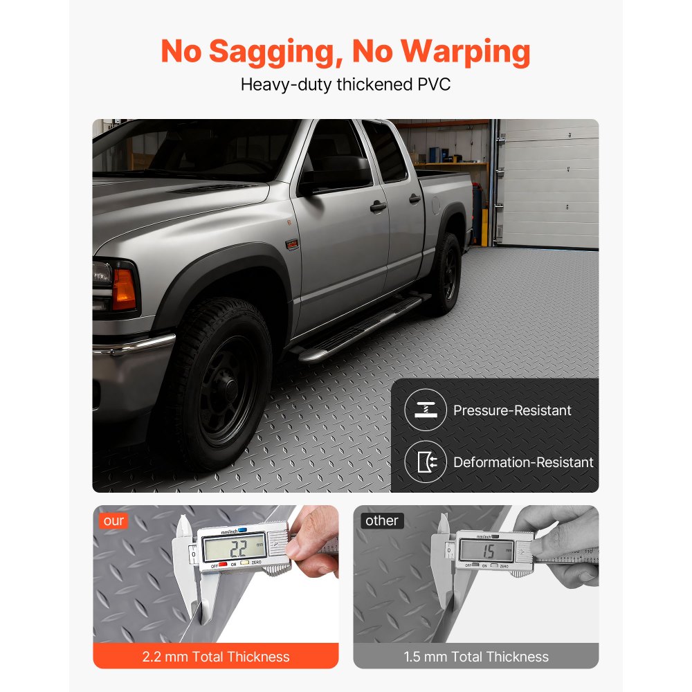 Μεγαλύτερη Κάλυψη: Αυτό το ρολό δαπέδου γκαράζ έχει διαστάσεις 7,5 x 20 ft / 2280 x 6100 mm με επιφάνεια 150 τετραγωνικά πόδια, κατάλληλο για SUV μεσαίου μεγέθους, compact SUV, σπορ αυτοκίνητα, μοτοσικλέτες και αμαξίδια γκολφ, ενώ είναι επίσης ιδανικό για αποθήκες, πορτμπαγκάζ ή πεζοδρόμια. Μετρήστε το μέγεθος πριν από την αγορά. PVC βαρέως τύπου: Αυτό το χαλάκι δαπέδου γκαράζ είναι κατασκευασμένο από PVC βαρέως τύπου πάχους 2,2 mm, παρέχοντας εξαιρετική αντοχή στη φθορά και την πίεση. Αντέχει σε ρυμουλκούμενα, φορτηγά και βαρέα οχήματα χωρίς παραμόρφωση, εξασφαλίζοντας μακροχρόνια χρήση. Σταθερό και αντιολισθητικό: Η επιφάνεια με μοτίβο διαμαντιού αυτού του ρολού πατακιού γκαράζ έχει σχεδιαστεί για να μειώνει την ολίσθηση και να ενισχύει την πρόσφυση, επιτρέποντας ασφαλές περπάτημα και στάθμευση ακόμα και σε υγρές συνθήκες. Χρησιμοποιήστε την παρεχόμενη ταινία διπλής όψης για ισχυρή και διαρκή πρόσφυση. Εύκολος καθαρισμός: Κατασκευασμένος από αδιάβροχο PVC, αυτός ο κύλινδρος δαπέδου γκαράζ είναι ανθεκτικός στη βρωμιά, τη λάσπη, τα υγρά των οχημάτων και τα χημικά, διατηρώντας τον χωρίς λεκέδες. Απλώς καθαρίστε με ηλεκτρική σκούπα, σφουγγαρίστρα ή υγρό πανί, διατηρώντας μια φρέσκια επιφάνεια ακόμα και υπό έντονη χρήση. Εύκολη εγκατάσταση και κοπή: Αυτά τα χαλάκια δαπέδου γκαράζ είναι εύκολα στην τοποθέτηση για ένα λείο, ομοιόμορφο δάπεδο. Μπορεί να κοπεί με ψαλίδι ή ένα μαχαίρι γενικής χρήσης σε οποιοδήποτε σχήμα ή μέγεθος, παρέχοντας εξαιρετική κάλυψη δαπέδου για οποιαδήποτε περιοχή.