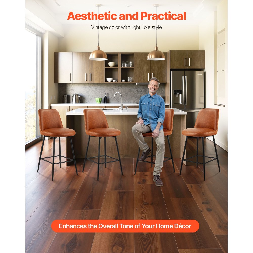Ισχυρή και σταθερή στήριξη βάρους: Τα σκαμπό μπαρ διαθέτουν χοντρούς σωλήνες από σίδηρο με σταθερή δομή, προσφέροντας μέγιστη ικανότητα φόρτωσης βάρους έως και 136 κιλά. Τα πόδια των σκαμπό είναι επικαλυμμένα με φινίρισμα ψεκασμού για αντοχή στη σκουριά και τις γρατσουνιές. Άνετο και περιστρεφόμενο: Εξοπλισμένο με σχεδιασμό περιστροφής 360°, το σκαμπό μπαρ επιτρέπει την εύκολη αλληλεπίδραση. Το μαξιλάρι του καθίσματος είναι γεμάτο με σύνθετο αφρό υψηλής πυκνότητας και καλύπτεται από δέρμα PU. Η παχιά πλάτη εφαρμόζει άνετα στην πλάτη σας. Εύκολη συναρμολόγηση και συντήρηση: Τα σκαμπό ύψους πάγκου είναι κατασκευασμένα από αδιάβροχο δέρμα PU. Ένα απλό σκούπισμα με ένα στεγνό πανί θα τα διατηρήσει πεντακάθαρα. Συνοδεύεται από εργαλεία εγκατάστασης, η συναρμολόγηση είναι απλή και φιλική προς τους αρχάριους, επιτρέποντας γρήγορη εγκατάσταση. Πρακτικό σετ: Το σετ περιλαμβάνει 2 σκαμπό μπαρ, διαστάσεων 19,49x21,65x38,58 ίντσες το καθένα, με ύψος καθίσματος 27 ίντσες. Αυτή η καρέκλα μπαρ είναι ιδανική για νοικοκυριά δύο ατόμων ή για ανοιχτή διαρρύθμιση κουζίνας, για μετάβαση μεταξύ φαγητού, κοινωνικοποίησης και δραστηριοτήτων γραφείου. Ελαφριά πολυτέλεια και ευελιξία: Το vintage καφέ δέρμα PU σε συνδυασμό με την κομψή καμπυλωτή πλάτη, είναι κατάλληλο τόσο για οικιακούς όσο και για επαγγελματικούς χώρους. Το κανονικό ύψος καθίσματος ταιριάζει σε διάφορους κανονικούς πάγκους μπαρ και νησίδες κουζίνας.
