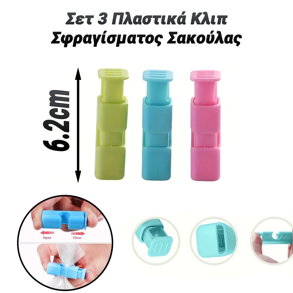 Σετ 3 Πλαστικά Κλιπ Σφραγίσματος Σακούλας – Ιδανικό για Άριστη Συντήρηση Τροφίμων και Υλικών! Το Σετ 3 Πλαστικών Κλιπ Σφραγίσματος Σακούλας είναι η τέλεια λύση για τη σφράγιση και τη διατήρηση των τροφίμων ή άλλων υλικών σε σακούλες. Με τον έξυπνο σχεδιασμό τους, εξασφαλίζουν τη σωστή σφράγιση και προστασία από την υγρασία, τον αέρα και άλλες εξωτερικές συνθήκες, διατηρώντας τα φρέσκα και ασφαλή για μεγαλύτερο χρονικό διάστημα. Χαρακτηριστικά: ✔ Συσκευασία 3 Τεμαχίων✔ Ασφαλής Σφράγιση✔ Εύκολη Χρήση Επιλέξτε το Σετ 3 Πλαστικών Κλιπ Σφραγίσματος Σακούλας και κρατήστε τα τρόφιμα και τα αντικείμενά σας ασφαλή και προστατευμένα απλά και αποτελεσματικότητα!