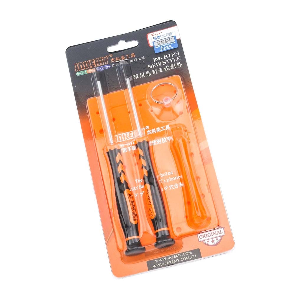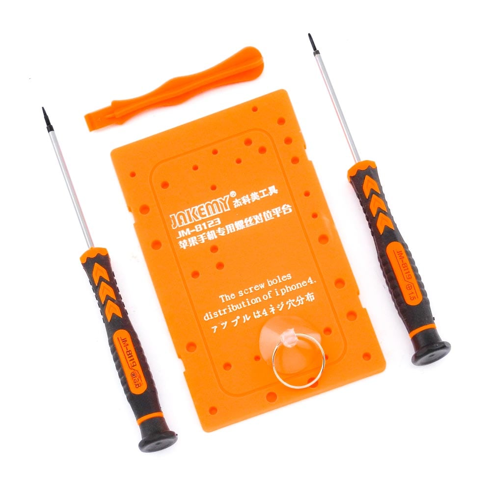 Σετ αποσυναρμολόγησης JM-8123 για iPhone 4 από την JAKEMY. Ένα χρήσιμο σετ πέντε εργαλείων αποσυναρμολόγησης, ιδανικό για όλα τα εργαστήρια ηλεκτρονικών και τεχνικών smartphone. Τώρα μπορείτε να κάνετε τις επισκευές σας πάνω στην ειδική αντιστατική βάση στήριξης, που σας παρέχει ασφάλεια και άνεση σε όλες σας τις κινήσεις! Περιεχόμενα: 1 βάση στήριξης επισκευών, ειδικά σχεδιασμένη για αποσυναρμολογήσεις iPhone 4 με αποθηκευτικό χώρο για βίδες 1 κατσαβίδι JM-8119 Phillips 1.5mm 1 κατσαβίδι JM-8119 Pentacle Star 0.8mm 1 πλαστικό stick ανοίγματος 1 βεντούζα με λαβή δαχτυλιδιού DOA 14 ημερών