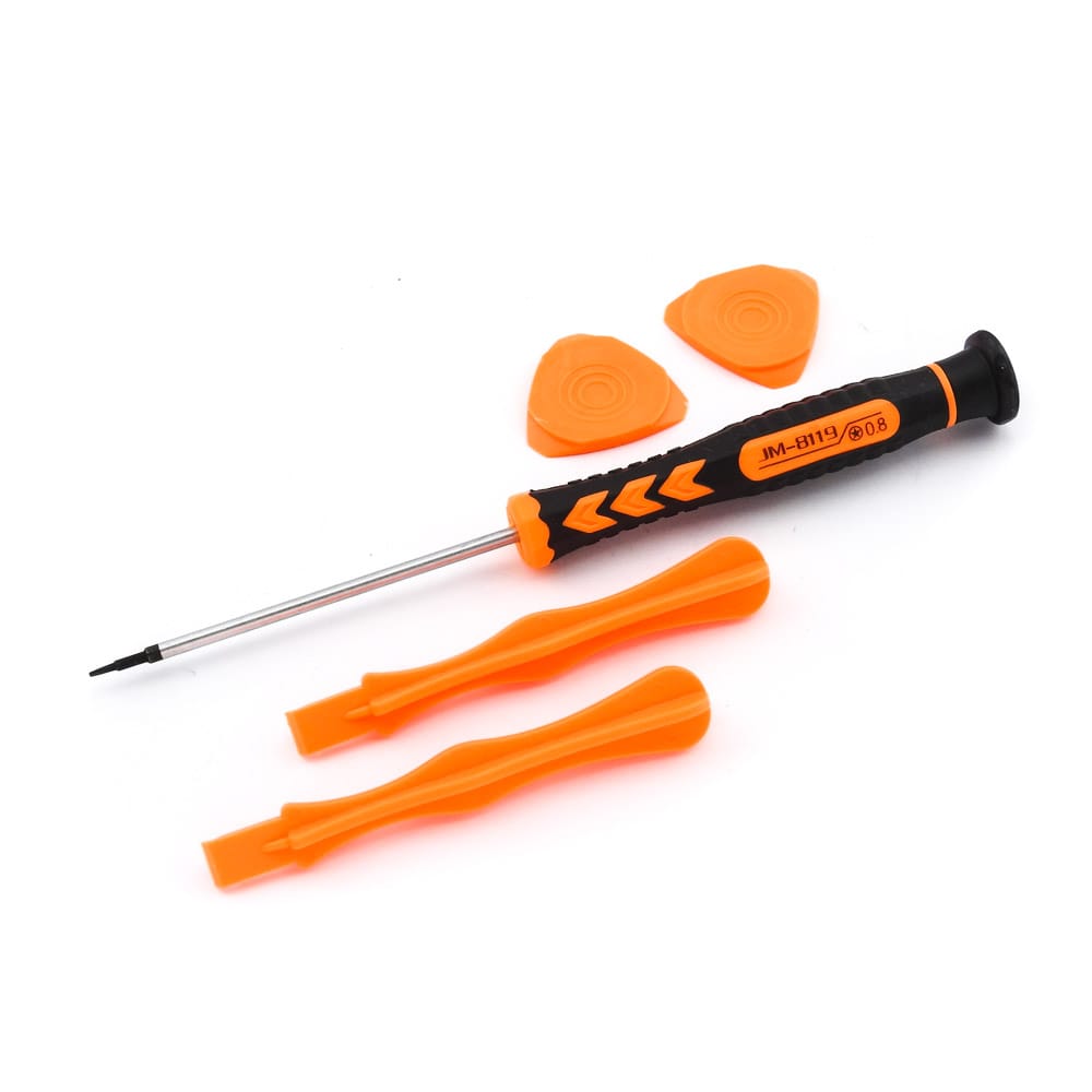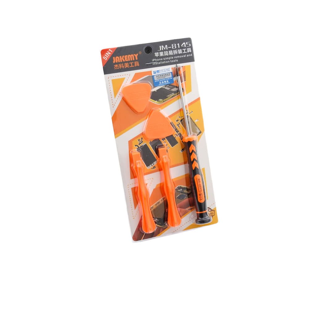 Σετ αποσυναρμολόγησης JM-8145 για iPhone από την JAKEMY. Ένα χρήσιμο σετ 5 τεμαχίων αποσυναρμολόγησης για iPhone, ιδανικό για όλα τα εργαστήρια ηλεκτρονικών και τεχνικών smartphone. Περιεχόμενα: 1 κατσαβίδι Pentacle Star 0.8mm JM-8119 με περιστρεφόμενη εργονομική λαβή 2 πλαστικά stick openers από αντιστατικό πλαστικό 2 πλαστικές πένες από αντιστατικό πλαστικό DOA 14 ημερών