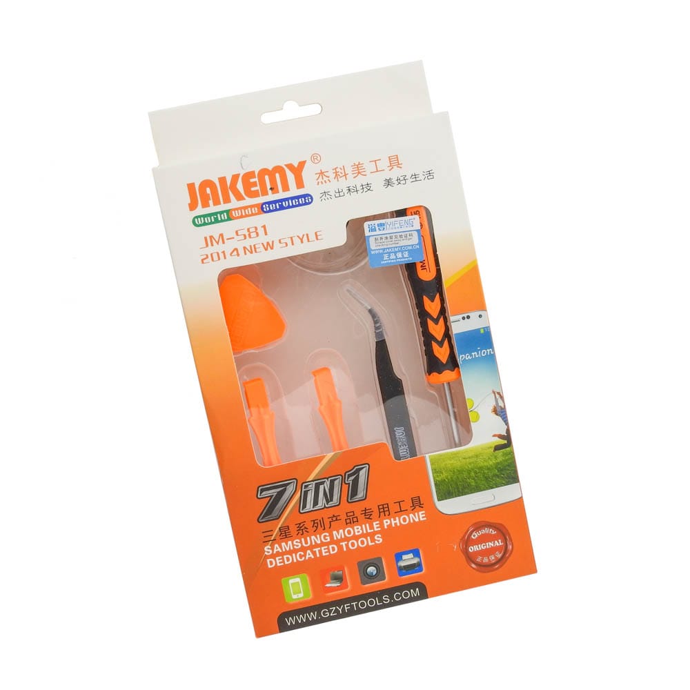 Σετ αποσυναρμολόγησης JM-S81 ιδανικό για smartphone της Samsung από την JAKEMY. Ένα χρήσιμο σετ 7 τεμαχίων αποσυναρμολόγησης για smartphones, ιδανικό για όλα τα εργαστήρια ηλεκτρονικών και τεχνικών smartphone. Περιεχόμενα: 1 κατσαβίδι Phillips 1.5mm JM-8119 με περιστρεφόμενη εργονομική λαβή 2 πλαστικά stick openers από αντιστατικό πλαστικό 2 πλαστικές πένες από αντιστατικό πλαστικό 1 γωνιακή προσέλα (T3-15) 1 βεντούζα με λαβή δαχτυλιδιού DOA 14 ημερών
