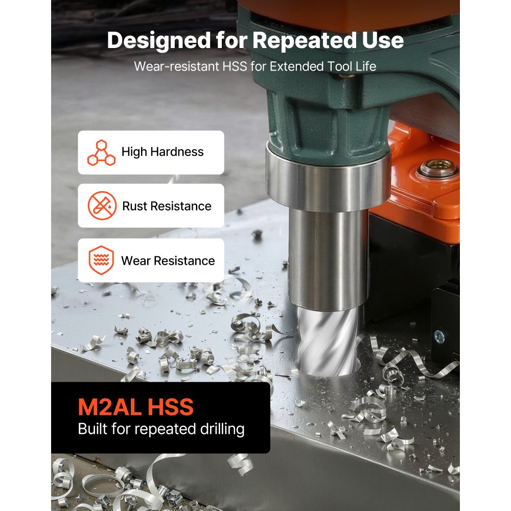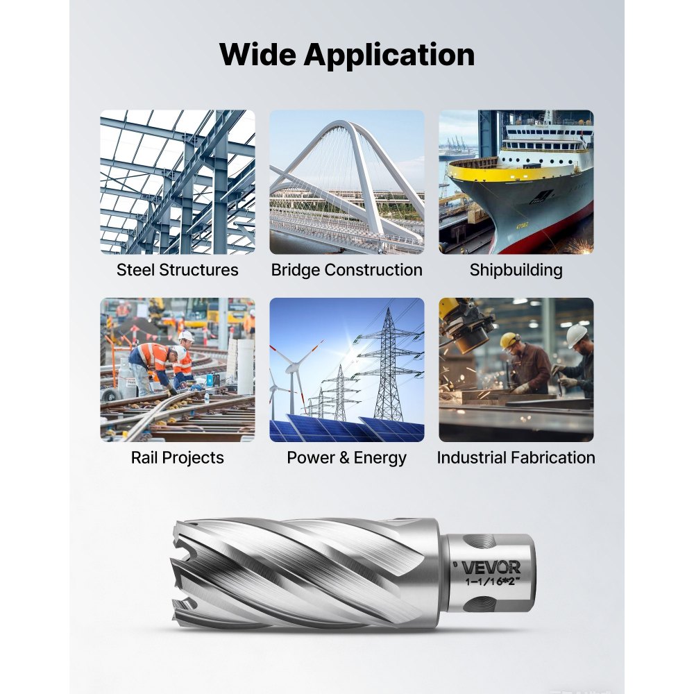 Υψηλής ταχύτητας χάλυβας M2AL υψηλής ποιότητας: Με εξαιρετική αντοχή στη φθορά και απόδοση σε υψηλές θερμοκρασίες, αυτό το σετ δακτυλιοειδών κοπτών προσφέρει μεγαλύτερη διάρκεια ζωής. Τα αξεσουάρ μας είναι συμβατά με σχεδόν όλες τις μεγάλες μάρκες μηχανημάτων. Σετ κοπτικών 13 τεμαχίων για καθημερινό τρύπημα: Τα τρυπάνια mag περιλαμβάνουν 11 κοπτικά (7/16", 1/2", 9/16", 11/16", 5/8", 3/4", 13/16", 7/8", 15/16", 1", 1-1/16"), δύο ακίδες οδηγούς 1/4" x 4", καθώς και μια θήκη αποθήκευσης για οργάνωση. Οι ακίδες οδηγούς ασφαλίζουν τα τεμάχια εργασίας. Υποστηρίζει ομαλή ροή τσιπ: Αυτά τα δακτυλιοειδή τρυπάνια διαθέτουν δακτυλιοειδή σχεδιασμό κοπής που κόβει μόνο όπου χρειάζεται, ενώ οι διευρυμένες εγκοπές τσιπ βοηθούν στη μείωση της συσσώρευσης τσιπ κατά τη διάτρηση. Η επίπεδη και μυτερή γεωμετρία της λεπίδας υποστηρίζει σταθερή είσοδο κοπής. Στέλεχος γενικής χρήσης 3/4" για ευρεία συμβατότητα εργαλείων: Αυτές οι δακτυλιοειδείς μύτες διαθέτουν στέλεχος γενικής χρήσης 3/4", συμβατό με τα περισσότερα μαγνητικά τρυπάνια που χρησιμοποιούν τυπικούς σφιγκτήρες. Εύκολη εγκατάσταση και αποσύνδεση κατά τη διάρκεια τακτικών αλλαγών εργαλείων. Ευρεία εφαρμογή στην κατεργασία μετάλλων: Αυτοί οι δακτυλιοειδείς κόφτες λειτουργούν με δομικό χάλυβα, ανοξείδωτο χάλυβα, αλουμίνιο, χυτοσίδηρο και χαλκό. Είναι ιδανικοί για διάτρηση σε χαλύβδινες κατασκευές, κατασκευές γεφυρών, σιδηροδρομικά έργα, ναυπηγική και γενική μεταλλική κατασκευή.