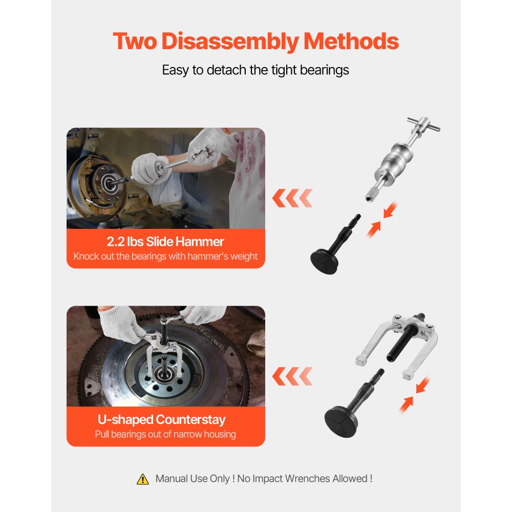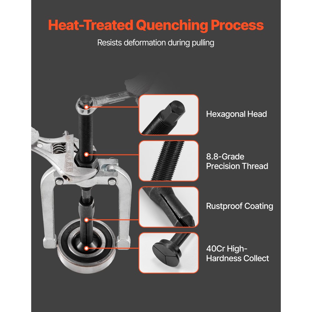 Σετ αφαίρεσης ρουλεμάν 16 τεμαχίων: Το σετ εξολκέων συρόμενου σφυριού περιλαμβάνει δέκα συλλέκτες, τρεις προσαρμογείς βιδών, ένα κιτ συρόμενου σφυριού, ένα αντίβαρο σχήματος U και μια βίδα M10. Αποσπά κολλημένα εξαρτήματα μεγέθους από 1/4 έως 2-1/3 ίντσες (6-59 mm). Διπλές Λειτουργίες: Αυτός ο εξολκέας ρουλεμάν συρόμενου σφυριού παρέχει δύο μεθόδους αφαίρεσης: το συρόμενο σφυρί και το αντίβαρο σχήματος U. Χρησιμοποιεί το συρόμενο σφυρί 3,1 λίβρες για αφαίρεση μέσω αδράνειας, ενώ το αντίβαρο είναι ιδανικό για στενούς χώρους. Επεκτεινόμενα κολάρα: Με δέκα κολάρα για διάφορα μεγέθη ρουλεμάν, το σετ συρόμενων σφυριών μας εξασφαλίζει άνετη εφαρμογή επιτρέποντας ελαφριά διαστολή μέσω σύσφιξης με πείρο. Αποφεύγει τη χαλάρωση κατά τις λειτουργίες συρόμενης σφύρας, μειώνοντας τον κίνδυνο βλάβης. Δακτύλιοι υψηλής θερμοκρασίας με σκλήρυνση: Κατασκευασμένοι από χάλυβα Cr40 με σκλήρυνση υψηλής θερμοκρασίας, οι συλλέκτες μας είναι ανθεκτικοί στη φθορά και την παραμόρφωση. Το κιτ συρόμενου σφυριού αντέχει σε ισχυρές κρούσεις με σφυρί και στο φορτίο εργασίας μεταξύ των ρουλεμάν στερέωσης για ανθεκτικότητα. Ανθεκτικό στη σκουριά και ανθεκτικό: Κατασκευασμένο από χάλυβα υψηλής σκληρότητας με αντισκωριακή επίστρωση, το εξολκέα σφυριού μας αντέχει σε βαριά χρήση χωρίς παραμόρφωση. Οι πείροι, το αντίβαρο σχήματος U και οι προσαρμογείς βιδών υποβάλλονται σε θερμική επεξεργασία για βελτιωμένη σκληρότητα.