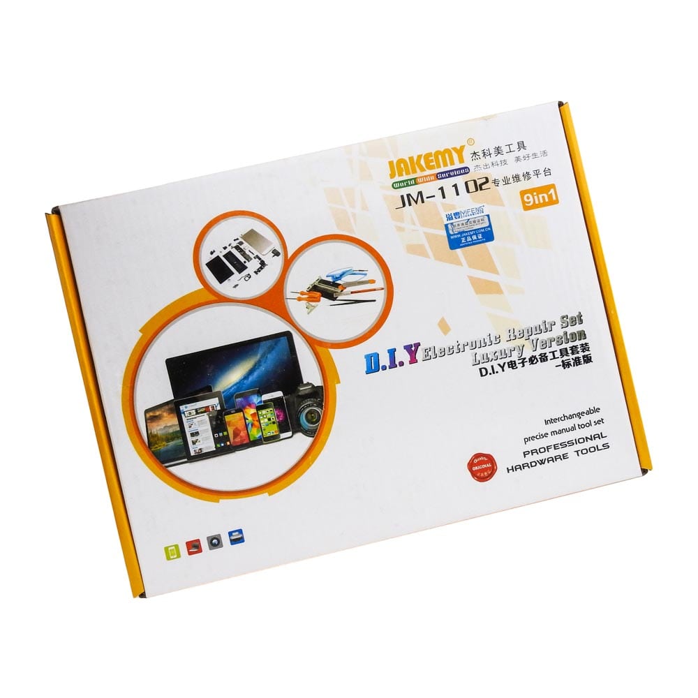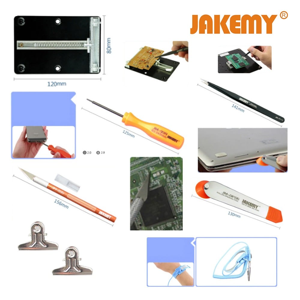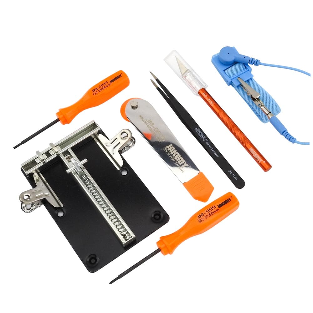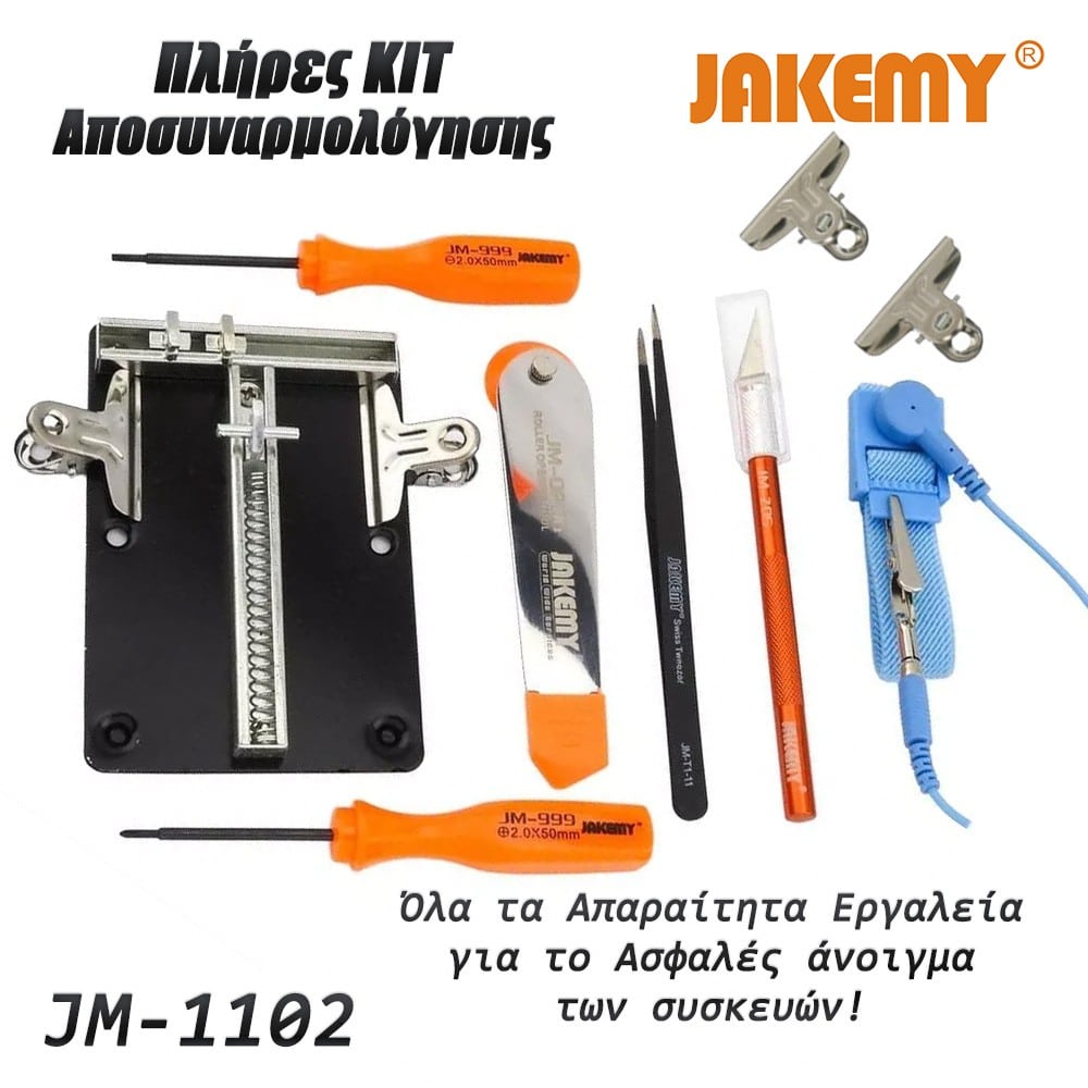 Σετ Εργαλείων Αποσυναρμολόγησης για Κινητά JM-1102 από τήν JAKEMY. Ιδανικό σετ εργαλείων για την αποσυναρμολόγηση κινητών τηλεφώνων, tablet, κ.α. Το JM-1102 προσφέρει όλα τα απαραίτητα εργαλεία για να κάνετε άψογη, σίγουρη και γρήγορη δουλειά! Τα εργαλεία είναι φτιαγμένα από αντιστατικά και ανθεκτικά υλικά άνετα χρήση. Χαρακτηριστικά : 1 Κατσαβίδι Slotted 2.0mm 1 Κατσαβίδι Philips 2.0mm 1 Αντιστατικό περικάρπιο 1 Προσέλα ίσια Τ1-11 2 Μεταλίκες πιάστρες (clips) 1 Μεταλικό ανοιχτήρι ροδέλα 1 Μεταλικό νυστέρι 1 Μεταλική βάση στήριξης πλακετών (12Χ8 cm) DOA 14 ημερών