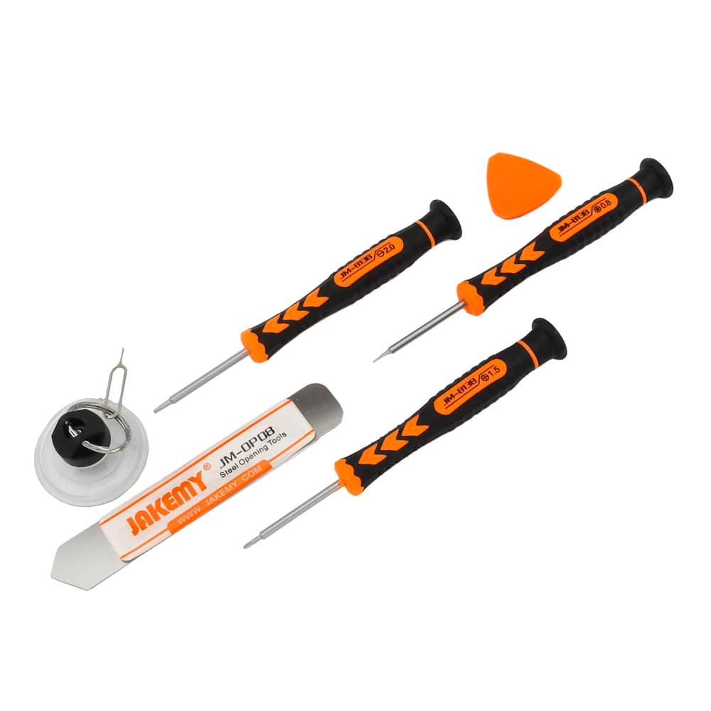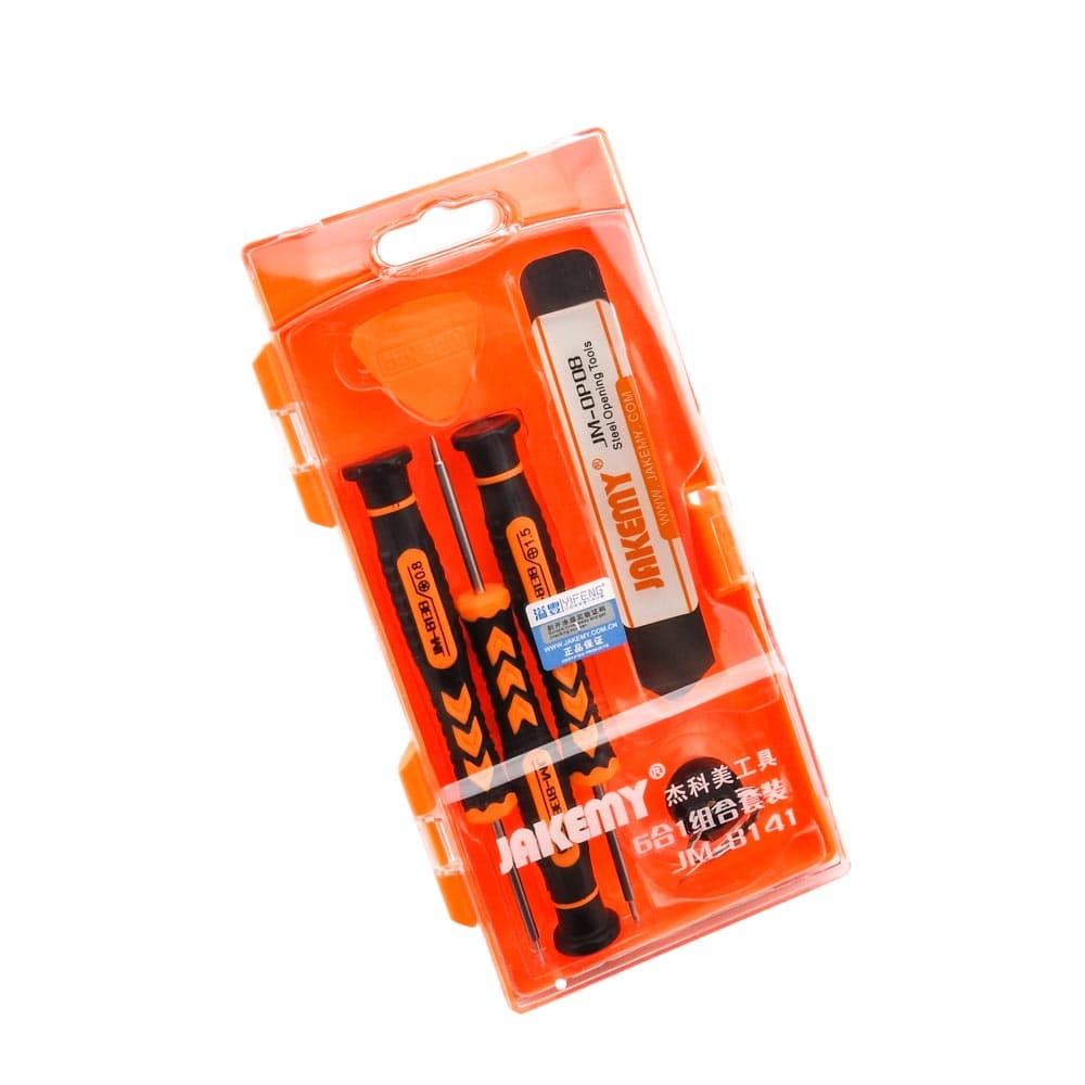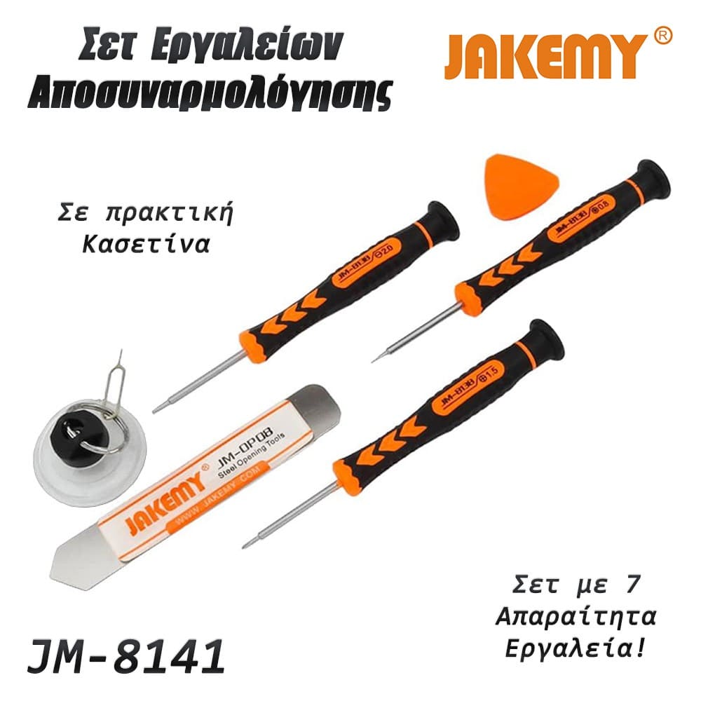 Σετ αποσυναρμολόγησης JM-8141 από την JAKEMY. Ένα σετ αποσυναρμολόγησης με κατσαβίδια, βεντούζα και ανοιχτήρια, χρήσιμο για όλα τα εργαστήρια ηλεκτρονικών, τεχνικών smartphones και τεχνικών Η/Υ. Με την εργονομική και περιστρεφόμενη λαβή των κατσαβιδιών μπορείτε να δουλεύετε ξεκούραστα ακόμη και όταν πρόκειται για πολύωρη και συνεχή εργασία. Χαρακτηριστικά: Κατσαβίδι μήκους 138mm Αντιολισθητική λαβή από PP&TRP Υλικά κατασκευής από κράμα CR-V Περιστρεφόμενη κεφαλή για εύκολη χρήση στο βίδωμα-ξεβίδωμα Μαγνητική μύτη Περιεχόμενα: 1 Slotted: 2.0 1 Phillips: 1.5 1 Pentable (star): 0.8 1 Ισχυρή βεντούζα με ακίδα για Sim Tray 1 Μεταλλικό ανοιχτήρι (JM-OP08) DOA 14 ημερών