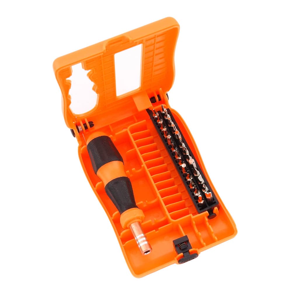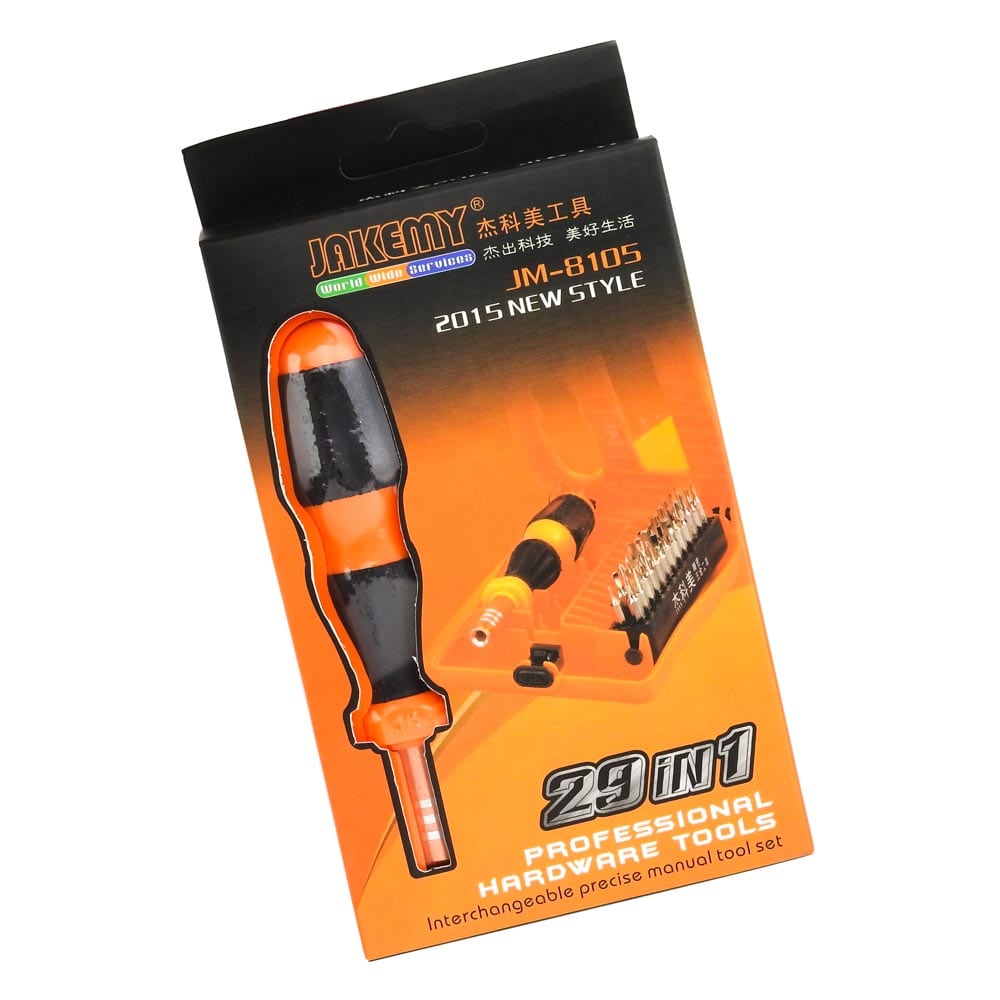 ΣΕΤ Κατσαβίδι με μύτες JM-8105 από την JAKEMY. Ένα σετ 26 μυτών με κατσαβίδι για όλα τα εργαστήρια ηλεκτρονικών, τεχνικών smartphones και τεχνικών Η/Υ. Το σετ περιέχει 1 κατσαβίδι 100mm και 26 μύτες από κράμα χρωμίου-χάλυβα οι οποίες είναι επικαλυμένες με χρώμιο. Εργονομικά σχεδιασμένη λαβή ανθεκτική στην ολίσθηση για άνετη συγκράτηση. Η σύνδεση των μυτών (bits) με μαγνήτη διευκολύνει την αφαίρεση και αλλαγή τους από την βάση του κατσαβιδιού. Χαρακτηριστικά: Μύτες: 26 PCS 4*28mm κράμα χρωμίου-χάλυβα Slotted: 1.5/ 2.0/ 2.5/ 3.0 Phillips: 1.0/ 1.5/ 2.0/ 2.5 Torx: T3/ T4/ T5/ T6/ T7/ T8/ T9/ T10/ T15/ T20 Hex: H1.3/ H1.5/ H3.0/ H4.0 Tri-Wing: Y2 Triangle: 2.0 Pentable(Star): 0.8 U-Shaped: U2.6 DOA 14 ημερών