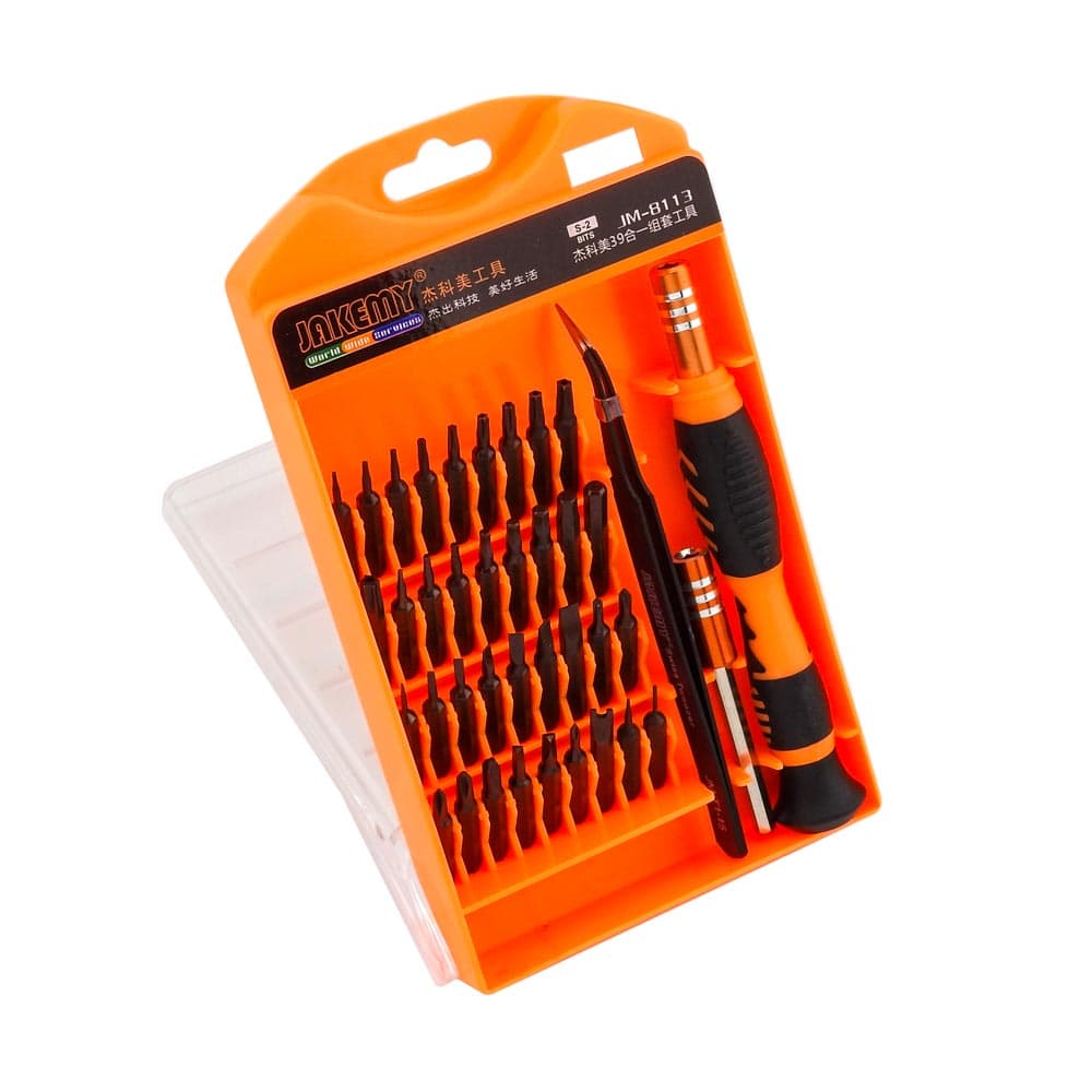 Σετ κατσαβίδι με μύτες JM-8113 από την JAKEMY. Ένα σετ 36 μυτών με κατσαβίδι, χρήσιμο για όλα τα εργαστήρια ηλεκτρονικών, τεχνικών smartphones και τεχνικών Η/Υ. Το σετ σας προσφέρει ένα κατσαβίδι με μαγνητική υποδοχή μυτών τύπου 4mm, ιδανικό για όλα τα laptops, tablets, smartphones και όχι μόνο. Με την εργονομική περιστρεφόμενη λαβή μπορείτε να δουλεύετε ξεκούραστα ακόμη και όταν πρόκειται για πολύωρη και συνεχή εργασία. Χάρη στην προέκταση μήκους 60mm, μπορείτε να έχετε πρόσβαση στα δυσπρόσιτα σημεία, ενώ με την γωνιακή προσέλα που περιλαμβάνει το σετ, έχετε τον έλεγχο μικροϋλικών πάνω στις λεπτομερείς εργασίες σας. Επίσης, η μαγνητική υποδοχή μυτών της προέκτασης θα σας διευκολύνει στην γρήγορη αφαίρεση και εναλλαγή των μυτών. Περιεχόμενα: Εργαλεία: 1 κατσαβίδι για μύτες τύπου 4mm, με μαγνητική υποδοχή και αντιολισθητική περιστρεφόμενη λαβή 1 προέκταση μήκους 60mm 1 γωνιακή προσέλα (T1-15) Μύτες: 36 PCS 4*28mm από επισκληρυμένο ατσάλι Slotted: 1/ 1.5/ 2/ 2.5/ 3/ 3.5/ 4 Phillips: 1/ 1.5/ 2/ 2.5/ 3.5 Torx: T3/ T4/ T5/ T6/ T7/ T8/ T9/ T10/ T15/ T20 Hex: H0.9/ H1.3/ H1.5/ H2/ H2.5/ H3/ H3.5/ H4 Tri-Wing: Y2 Triangle: 2/ 2.3 Pentacle Star: 0.8 U-Shaped: U2.6 Round: R0.8 DOA 14 ημερών