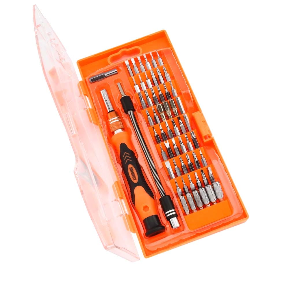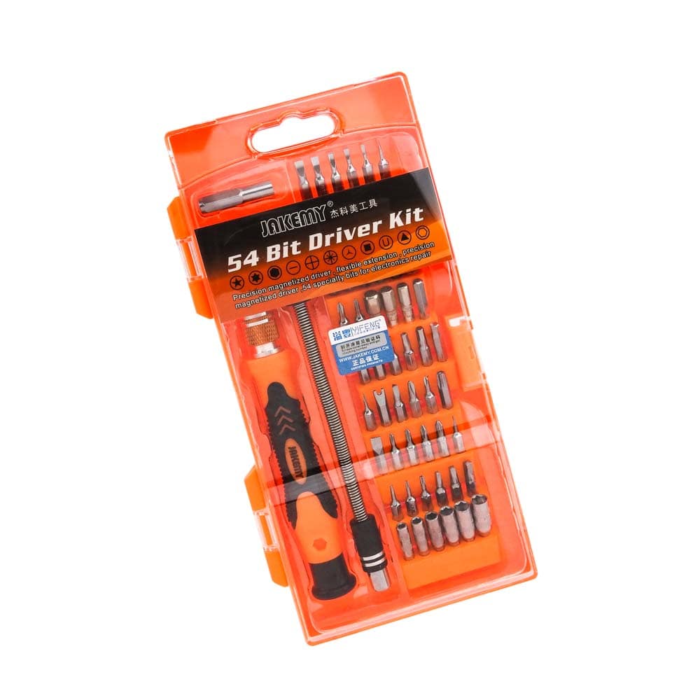 Σετ κατσαβίδι με μύτες JM-8125 από την JAKEMY. Ένα σετ 54 μυτών με κατσαβίδι, χρήσιμο για όλα τα εργαστήρια ηλεκτρονικών, τεχνικών smartphones και τεχνικών Η/Υ. Το σετ σας προσφέρει ένα κατσαβίδι με μαγνητική υποδοχή μυτών τύπου 4mm, ιδανικό για όλα τα laptops, tablets, smartphones και όχι μόνο. Χάρη στην προέκταση μεταβλητού μήκους ως 120mm σε σκάλες πέντε θέσεων, μπορείτε να έχετε πρόσβαση ακόμη και στα δυσκολότερα σημεία των εργασιών σας. Επίσης, για τα ακόμη πιο δυσπρόσιτα σημεία εργασίας το σετ περιλαμβάνει μια ευλύγιστη προέκταση με ελατήριο μήκους 130mm. Με εργονομικά σχεδιασμένη και αντιολισθητική περιστρεφόμενη λαβή, θα έχετε άνετη συγκράτηση ακόμη και όταν η εργασία απαιτεί μεγαλύτερες πιέσεις στο βίδωμα-ξεβίδωμα. Τέλος, η μαγνητική υποδοχή μυτών, σας διευκολύνει στην γρήγορη αφαίρεση και εναλλαγή των μυτών. Περιεχόμενα: Εργαλεία: 1 κατσαβίδι για μύτες τύπου 4mm, με μαγνητική υποδοχή και αντιολισθητική περιστρεφόμενη λαβή 1 προέκταση μεταβλητού μήκους 120mm με σκάλα 5 θέσεων 1 ευλύγιστη προέκταση με ελατήριο μήκους 130m 1 marble connector (αντάπτορας για καρυδάκι) Μύτες: 54 PCS 4*24mm κράμα χρωμίου Slotted: 1/ 1.5/ 2/ 2.5/ 3/ 3.5/ 4 Phillips: 1/ 1.5/ 2/ 2.5/ 3.5 Torx: T3/ T4/ T5/ T6/ T7/ T8/ T9/ T10/ T15/ T20 Hex: H0.9/ H1.3/ H1.5/ 2/ H2.5/ H3/ H3.5/ H4/ H4.5/ H5/ H6 Tri-Wing: Y2/ Y3 Triangle: 2.3 Jis: J000/ J00/ J0/ J1 U-Shaped: U2.6 Square: R0/ R1/ R2 Socket (καρυδάκια): M2.5/ M3/ M3.5/ M4/ M4.5/ M5 Pentacle Star: 0.8/ 1.2/ 1.5/ 2 DOA 14 ημερών