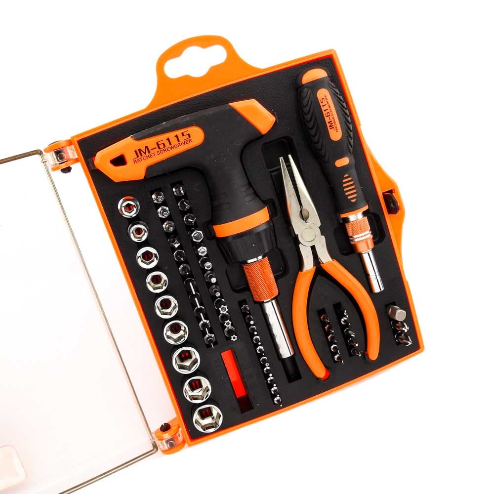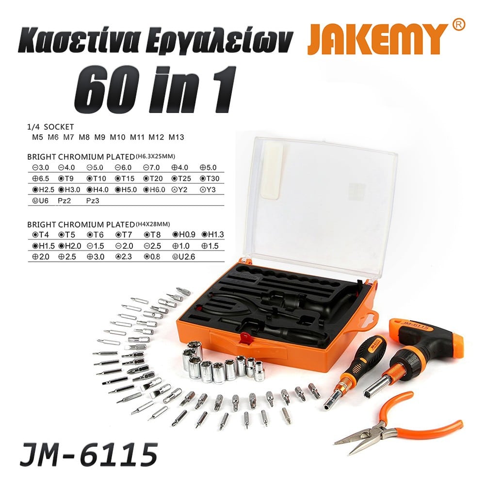 Σετ κατσαβιδιών καστάνιας με μύτες JM-6115 από την JAKEMY. Ένα σετ 53 μυτών με 2 κατσαβίδια, ιδανικό για όλα τα εργαστήρια ηλεκτρονικών, τεχνικών smartphones & τεχνικών Η/Υ. Το σετ περιλαμβάνει δύο κατσαβίδια διαφορετικού μεγέθους. Το κατσαβίδι τύπου 4mm θα σας διευκολύνει για τις εργασίες που η λεπτομέρεια είναι ο βασικός παράγοντας, ενώ το κατσαβίδι με την μεγαλύτερη λαβή Τ υποδοχής 6.3mm, θα σας χρειαστεί για όλα τα μαστορέματα γενικού τύπου. Χάρη στις 2 προεκτάσεις μεταβλητού μήκους με σκάλες, μπορείτε να έχετε πρόσβαση ακόμη και στα δυσκολότερα σημεία των εργασιών σας, ενώ η καστάνια θα σας διευκολύνει σε σημεία που το χέρι σας δεν μπορεί να κάνει πλήρη περιστροφή. Και τα δύο κατσαβίδια, φέρουν εργονομικά σχεδιασμένη και αντιολισθητική λαβή, ώστε να έχετε άνετη συγκράτηση ακόμη και όταν η εργασία απαιτεί μεγαλύτερες πιέσεις στο βίδωμα-ξεβίδωμα. Τέλος, η μαγνητική υποδοχή μυτών, σας διευκολύνει στην γρήγορη αφαίρεση και εναλλαγή των μυτών. Περιεχόμενα: Εργαλεία: 1 κατσαβίδι για μύτες τύπου 4mm, με μαγνητική υποδοχή και αντιολισθητική λαβή, και προέκταση μεταβλητού μήκους 1 κατσαβίδι για μύτες τύπου 6.3mm, με μαγνητική υποδοχή, αντιολισθητική λαβή τύπου T, και προέκταση μεταβλητού μήκους 1 μυτοτσίμπιδο 1 αντάπτορα για μύτες socket (καστάνια) Μύτες: 24 PCS 6.3*25mm κράμα χρωμίου Slotted: 3/ 4/ 5/ 6/ 7 Phillips: 4/ 5/ 6.5 Torx: T9/ T10/ T15/ T20/ T25/ T30 Tri-Wing: Y2/ Y3 Hex: H2.5/ H3/ H4/ H5/ H6 Pozi: Pz2/ Pz3 U-Shaped: U6 20 PCS 4*28mm κράμα χρωμίου Slotted: 1.5/ 2.0/ 2.5 Phillips: 1.0/ 1.5/ 2.0/ 2.5/ 3.0 Torx: T4/ T5/ T6/ T7/ T8 Triangle: 2.3 Hex: H0.9/ H1.3/ H1.5/ H2.0 Pentacle Star: 0.8 U-Shaped: U2.6 9 PCS 6.3*20mm κράμα χρωμίου Sockets (καρυδάκια): M5/ M6/ M7/ M8/ M9/ M10/ M11/ M12/ M13 DOA 14 ημερών