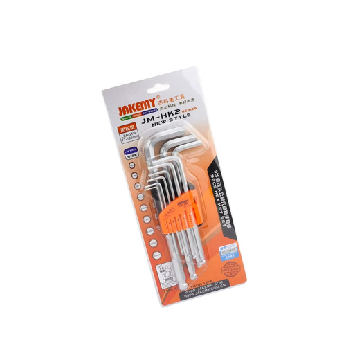 Σετ κλειδιών Allen JM-HK2-1 απο την JAKEMY. Ένα σετ εργαλείων Allen 9 μεγεθών με γαλβανιζέ επιφάνεια ιδανικό για όλους τους τεχνικούς Η/Υ και όχι μόνο. Περιεχόμενα: Μεγέθη κλειδιών: 1.5mm 2.0mm 2.5mm 3.0mm 4.0mm 5.0mm 6.0mm 8.0mm 10.0mm Χαρακτηριστικά: Υλικό κατασκευής CR-V με γαλβανιζέ επιφάνεια Με σχεδιασμό εξαγωνικού σφαιροειδούς σχήματος στην μια εκ των δύο απολήξεων Μέγιστη ωφέλιμη κλίση 25 μοιρών Ευρωπαϊκού τύπου προδιαγραφές Σπαστή θήκη για αποθήκευση των κλειδιών και την εύκολη μεταφορά τους DOA 14 ημερών