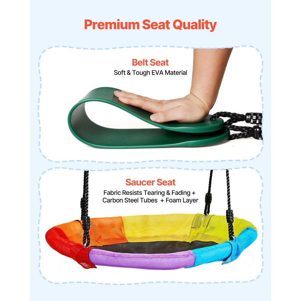 Ανθεκτική δομή: Αυτό το σετ κούνιας σε σχήμα Α για την αυλή αντέχει έως και 199,6 κιλά. Το ατσάλινο πλαίσιο σε σχήμα Α σχηματίζει μια σταθερή τριγωνική βάση και μπορεί να στερεωθεί στο έδαφος με τις παρεχόμενες σπειροειδείς αγκύρες εδάφους για σταθερή χρήση κατά την κούνια. Πολλαπλές επιλογές παιχνιδιού: Αυτή η κούνια με βάση περιλαμβάνει δύο καθίσματα - μια στρογγυλή κούνια με πιατάκι και μια κούνια με ζώνη - επιτρέποντας σε περισσότερα παιδιά να κουνιούνται ταυτόχρονα. Ρυθμιζόμενο ύψος: Το ύψος του σχοινιού ανάρτησης μπορεί να ρυθμιστεί ευέλικτα για να προσαρμόζεται σε διαφορετικά ύψη και προτιμήσεις χρήσης. Αυτό το σετ κούνιας καλύπτει τις συνεχείς ανάγκες των παιδιών καθώς μεγαλώνουν. Κατασκευασμένη για χρήση σε εξωτερικούς χώρους: Σχεδιασμένη με ποιοτικά υλικά, αυτή η κούνια με σκελετό είναι ιδανική για εξωτερικούς χώρους και επαναλαμβανόμενη καθημερινή χρήση. Διαθέτει επικαλυμμένους χαλύβδινους σωλήνες, ύφασμα καθίσματος που διατηρεί το χρώμα με την πάροδο του χρόνου, απαλές κούνιες ζώνης και ισχυρούς υφαντούς ιμάντες κρέμασης. Εύκολη συναρμολόγηση: Αυτή η κούνια εξωτερικού χώρου για παιδιά έχει σχεδιαστεί για εύκολη εγκατάσταση με πασσάλους εδάφους και τα απαραίτητα εργαλεία που περιλαμβάνονται. Οι προ-τρυπημένες τρύπες, τα μπουλόνια και ένα πλήρες κιτ εξαρτημάτων υποστηρίζουν γρήγορη συναρμολόγηση σε γρασίδι ή χώμα.