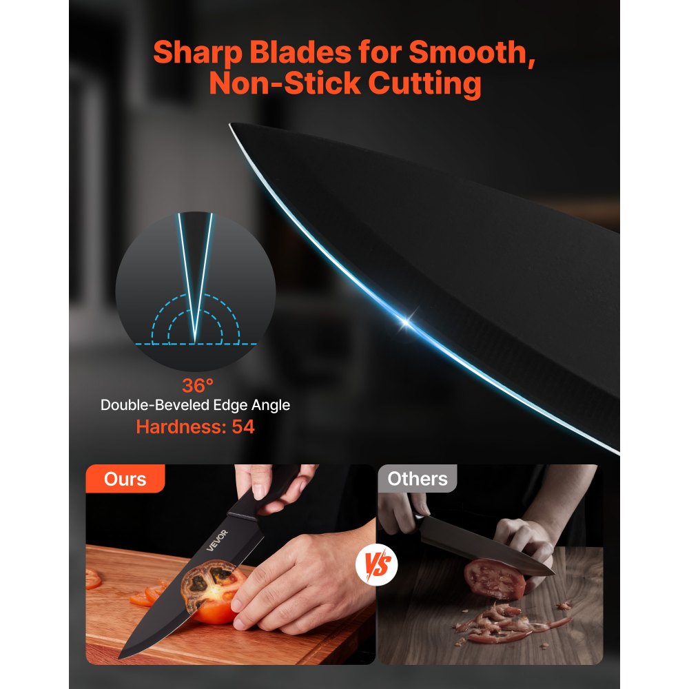 Σετ μαχαιριών κουζίνας 15 τεμαχίων: Αυτό το σετ μαχαιριών κουζίνας 15 τεμαχίων περιλαμβάνει ένα μαχαίρι σεφ 8 ιντσών, ένα μαχαίρι κοπής 8 ιντσών, ένα μαχαίρι ψωμιού 8 ιντσών, ένα μαχαίρι santoku 7 ιντσών, ένα μαχαίρι γενικής χρήσης 5 ιντσών, έξι μαχαίρια για μπριζόλες 4,5 ιντσών, ένα μαχαίρι ξεφλουδίσματος 3,5 ιντσών, μια ράβδο ακονίσματος 8 ιντσών, ψαλίδι κουζίνας και ένα ξύλινο μπλοκ. Ένα σετ καλύπτει τις καθημερινές ανάγκες κοπής, όπως τεμαχισμό, ψιλοκομμό και ξεφλούδισμα. Ο μοντέρνος σχεδιασμός του το καθιστά ιδανικό δώρο για γιορτές και ειδικές περιστάσεις. Εξαιρετική Ευκρίνεια: Κάθε λεπίδα είναι διπλά λοξοτομημένη και λεπτώς γυαλισμένη για μια λεπτότερη, πιο αιχμηρή άκρη που μειώνει την αντίσταση. Μπορείτε εύκολα και με ακρίβεια να χειρίζεστε υλικά με αυτό το σετ μαχαιριών, εξασφαλίζοντας ομαλές και ακριβείς κοπές κάθε φορά. Ανθεκτικό και ανθεκτικό στη σκουριά: Κατασκευασμένο από γερμανικό ανοξείδωτο ατσάλι υψηλής περιεκτικότητας σε άνθρακα 5CR15MOV, αυτό το σετ μαχαιριών παρέχει σκληρότητα και ανθεκτικότητα, αποφεύγοντας το ξεφλούδισμα ή το ράγισμα. Οι λεπίδες είναι θερμικά επεξεργασμένες, αμμοβολημένες και επικαλυμμένες με αντικολλητικό φινίρισμα για να παραμένουν ανθεκτικές στη σκουριά και αιχμηρές ακόμα και σε υγρές κουζίνες. Εξαιρετικά άνετη λαβή: Η εργονομική λαβή εφαρμόζει καλά στην παλάμη, προσφέροντας σταθερή, ισορροπημένη λαβή που μειώνει την κόπωση. Η ομαλή ισορροπία διατηρεί την κοπή χωρίς κόπωση, ενώ η εκλεπτυσμένη κατασκευή αποφεύγει το ράγισμα ή τη χαλάρωση, διασφαλίζοντας ότι αυτό το σετ μαχαιριών από ανοξείδωτο ατσάλι παραμένει αξιόπιστο. Εύκολη αποθήκευση και συντήρηση: Οι διαιρούμενες υποδοχές του μπλοκ μαχαιριών διευκολύνουν την πρόσβαση και την οργάνωση, αποφεύγοντας τυχαία κοψίματα. Όλες οι λεπίδες πλένονται στο πλυντήριο πιάτων για γρήγορο καθάρισμα. Αυτό το σετ μαχαιριών κουζίνας περιλαμβάνει επίσης μια ράβδο ακονίσματος 8 ιντσών για να διατηρείτε τα μαχαίρια σας αιχμηρά και σε ετοιμότητα ανά πάσα στιγμή.