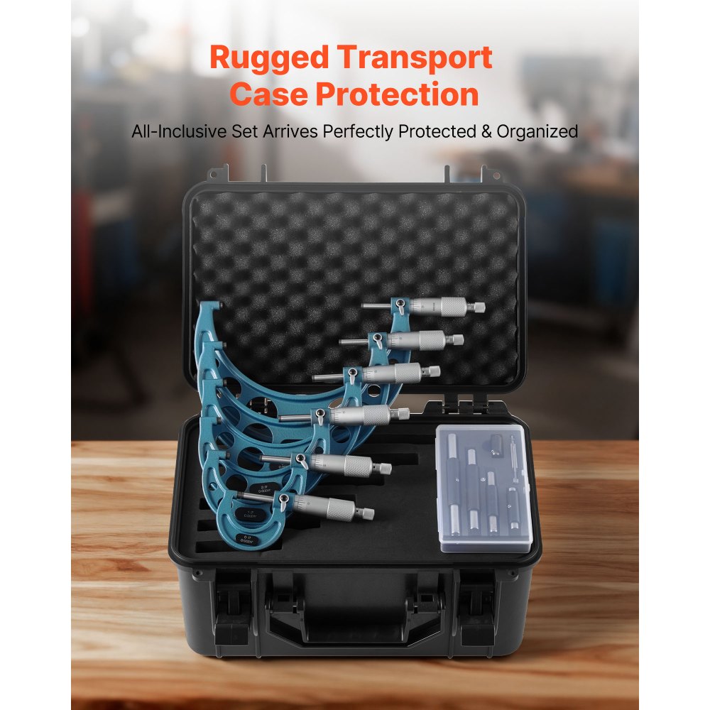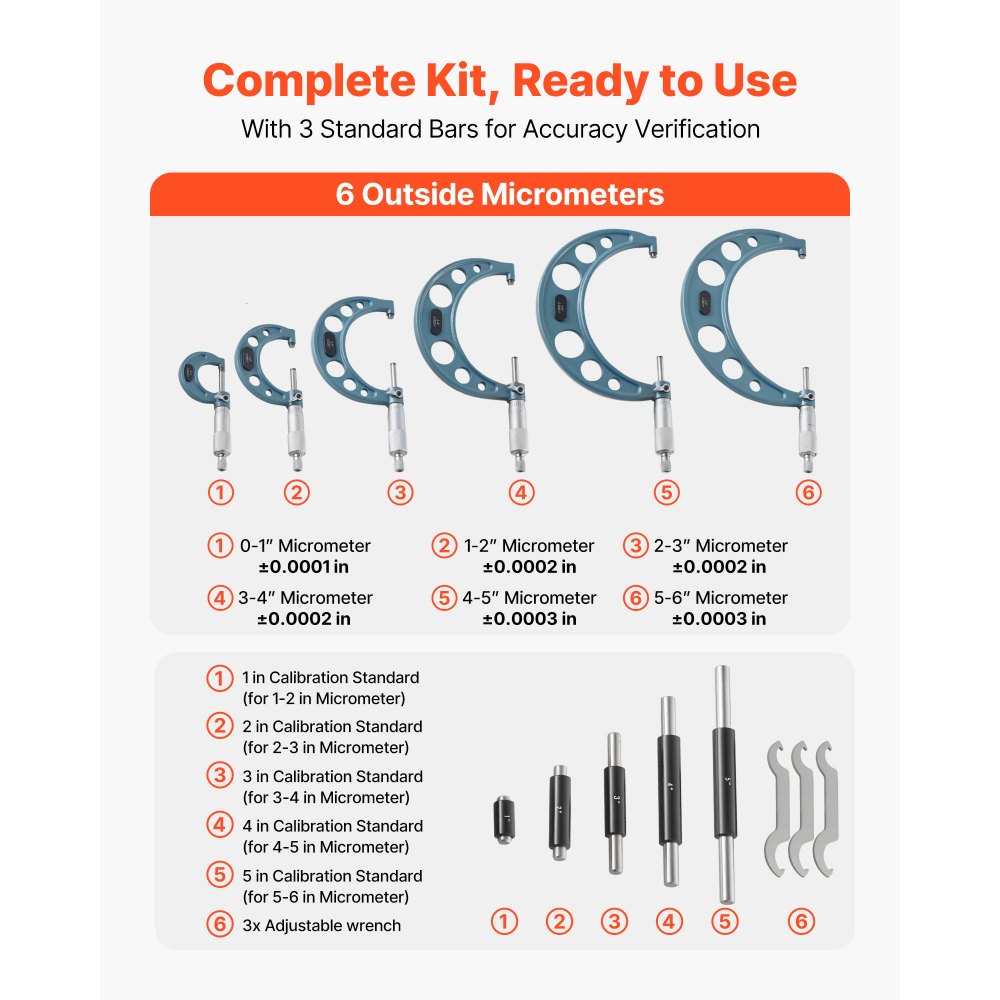 Σετ μικρομέτρων υψηλής ακρίβειας: Αυτό το σετ μικρομέτρων προσφέρει ακρίβεια ±0,0001 ίντσας, ±0,0002 ίντσας και ±0,0003 ίντσας, με έξι μικρόμετρα με οπή 0-6 ίντσας και πέντε ράβδους βαθμονόμησης για επαλήθευση. Ιδανικό για αξιόπιστη μέτρηση κινητήρα ή εξαρτημάτων ακριβείας. Εύκολη στην ανάγνωση και διαισθητική λειτουργία: Αυτό το σετ μικρομέτρων διαθέτει σαφείς σημάνσεις στο μανίκι και ένα κλειδί μηδενικής ρύθμισης, κάνοντας τις δυναμικές ρυθμίσεις απλές. Ο λείος άξονας εξασφαλίζει εύκολη ολίσθηση για γρήγορη τοποθέτηση εξαρτημάτων, διατηρώντας την ακρίβεια των μετρήσεων. Ακριβής απόδοση: Κατασκευασμένο με επιφάνεια μέτρησης με άκρη καρβιδίου, αυτό το ψηφιακό μικρόμετρο εξασφαλίζει μακροχρόνια ακρίβεια και αντοχή στη φθορά. Το παξιμάδι ασφάλισης αποτρέπει την ολίσθηση, ενώ η δακτύλιος καστάνιας προσφέρει ομαλό έλεγχο και σταθερή ακρίβεια με την πάροδο του χρόνου. Ευέλικτο για πολλαπλές εργασίες: Αυτό το μικρομετρικό εργαλείο μέτρησης διαθέτει ένα συμπαγές μεταλλικό πλαίσιο για αντοχή στη φθορά και διαρκή σταθερότητα. Ιδανικό για τη μέτρηση εξωτερικών διαμέτρων σωλήνων, μεταλλικών φύλλων και άλλων εξαρτημάτων σε μηχανουργικές εργασίες ή εργασίες ακριβείας. Πλήρες σετ: Αυτό το ψηφιακό μικρόμετρο συνοδεύεται από μια ειδική σκληρή θήκη που περιέχει έξι μικρόμετρα, πέντε ράβδους βαθμονόμησης, κλειδιά και οδηγίες. Διατηρεί τα εργαλεία οργανωμένα και φορητά, έτοιμα για ακριβείς μετρήσεις αμέσως μόλις τα βγάλετε από τη συσκευασία.