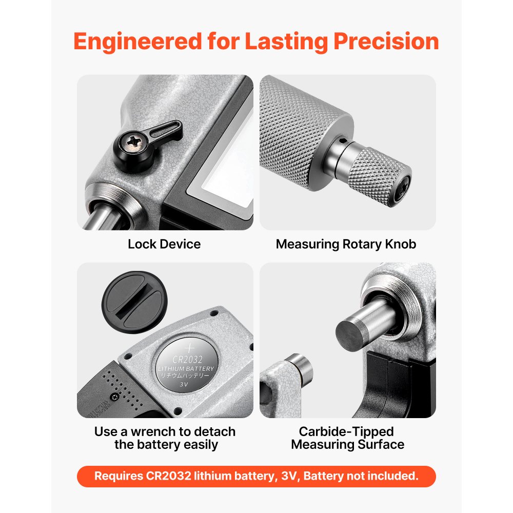 Σετ μικρομέτρων υψηλής ακρίβειας: Προσφέρει εύρος 0-1 ίντσας / 0-25,4 mm, ακρίβεια ±0,0001 ίντσας / ±0,003 mm και ανάλυση 0,00005 ίντσας / 0,001 mm. Είτε ελέγχει εξαρτήματα κινητήρα είτε λεπτά εξαρτήματα, αυτό το μικρόμετρο εξασφαλίζει συνεπείς και αξιόπιστες μετρήσεις κάθε φορά. Έξυπνη και εύκολη λειτουργία: Αυτό το σετ μικρομέτρων διαθέτει μεγάλη οθόνη LCD για καθαρές μετρήσεις, γρήγορο διακόπτη ίντσας/mm και διατήρηση δεδομένων για κλείδωμα τιμών σε δύσκολα σημεία. Η λειτουργία αυτόματης απενεργοποίησης 5 λεπτών αποφεύγει την σπατάλη ενέργειας, διευκολύνοντας την ακριβή μέτρηση. Ακριβής απόδοση: Κατασκευασμένο με επιφάνεια μέτρησης με άκρη καρβιδίου, αυτό το ψηφιακό μικρόμετρο εξασφαλίζει μακροχρόνια ακρίβεια και αντοχή στη φθορά. Το παξιμάδι ασφάλισης αποτρέπει την ολίσθηση, ενώ η δακτύλιος καστάνιας προσφέρει ομαλό έλεγχο και σταθερή ακρίβεια με την πάροδο του χρόνου. Ευέλικτο για πολλαπλές εργασίες: Αυτό το μικρομετρικό εργαλείο μέτρησης διαθέτει ένα συμπαγές μεταλλικό πλαίσιο για αντοχή στη φθορά και διαρκή σταθερότητα. Ιδανικό για τη μέτρηση εξωτερικών διαμέτρων σωλήνων, μεταλλικών φύλλων και άλλων εξαρτημάτων σε μηχανουργικές εργασίες ή εργασίες ακριβείας. Πλήρες σετ: Αυτό το ψηφιακό μικρόμετρο περιλαμβάνει μια ειδική σκληρή θήκη με 1 μικρόμετρο, κλειδί, κλειδί για το καπάκι της μπαταρίας και οδηγίες. Διατηρεί τα εργαλεία οργανωμένα, εύκολα στη μεταφορά και έτοιμα για ακριβείς μετρήσεις οποιαδήποτε στιγμή.