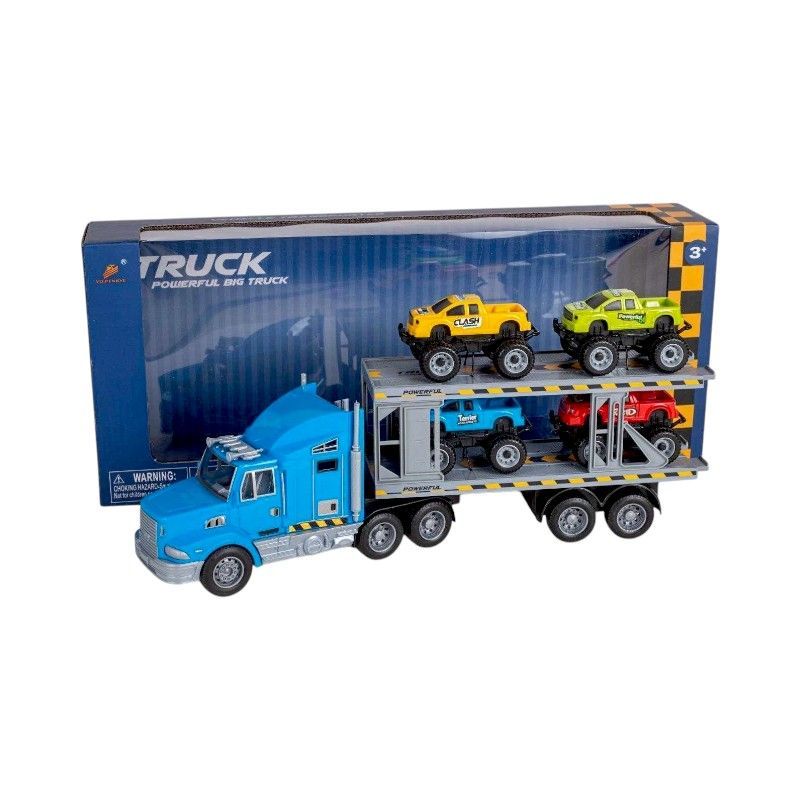Σετ όχημα μεταφοράς αυτοκινήτων με 4 αυτοκίνητα και πολλαπλές δυνατότητες παιχνιδιού.