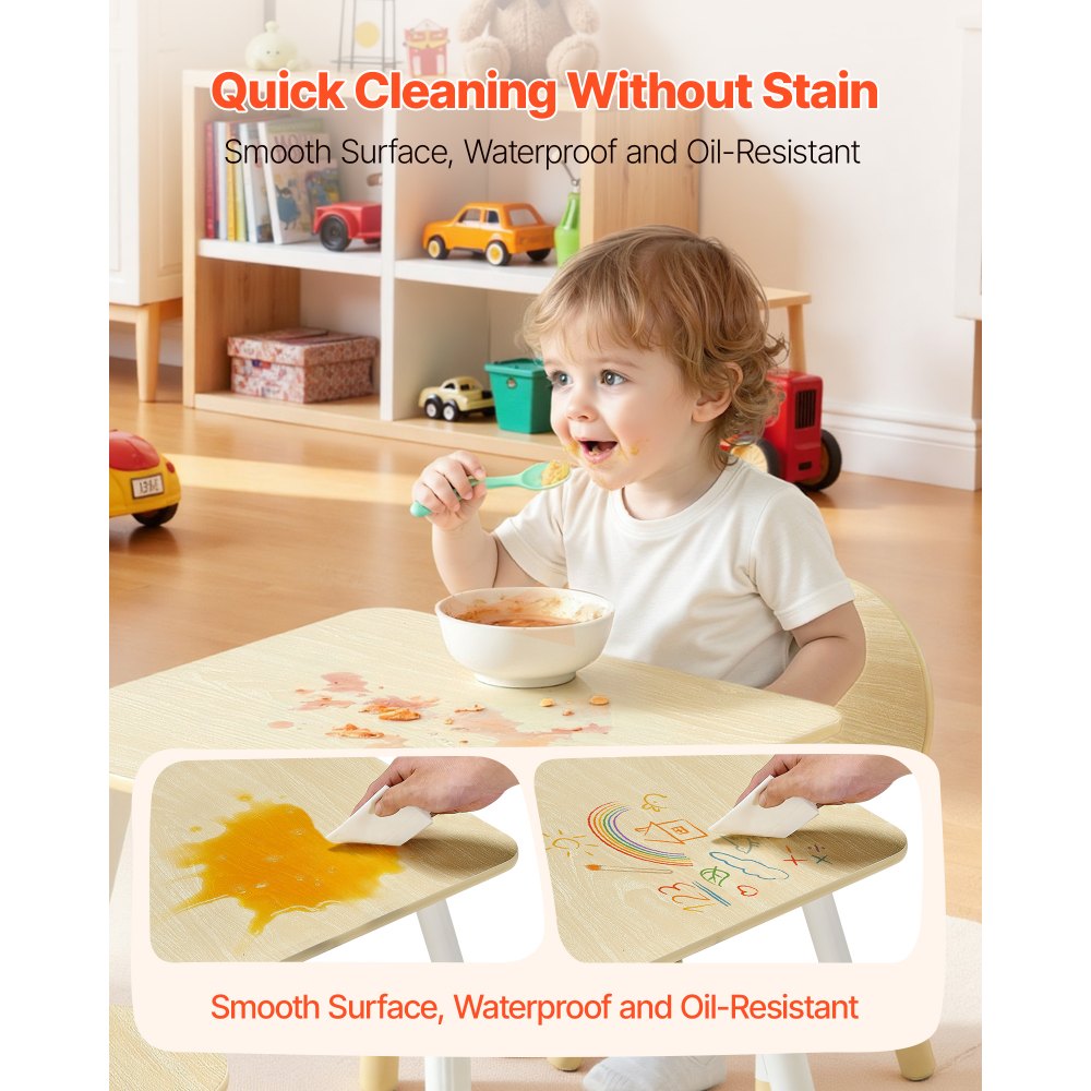 Σχεδιασμένο για ηλικίες 2–8 ετών: Αυτό το σετ παιδικού τραπεζιού και καρεκλών έχει το κατάλληλο μέγεθος για παιδιά, με τραπέζι 50 x 50 x 43,7 εκ. και καρέκλα 28,2 x 28,2 x 48 εκ., ιδανικό για γεύματα, χειροτεχνίες, παιχνίδια, σχέδιο και διάβασμα στο παιδικό δωμάτιο, το βρεφικό δωμάτιο ή το παιδικό υπνοδωμάτιο. Ανθεκτικό και στιβαρό: Αυτό το παιδικό τραπέζι και οι καρέκλες διαθέτουν πόδια από μασίφ πεύκο και επιφάνεια από MDF ποιότητας P2 για διαρκή χρήση. Το τραπέζι αντέχει βάρος έως και 49,9 κιλά, ενώ κάθε καρέκλα αντέχει βάρος 49,9 κιλά, εξασφαλίζοντας σταθερότητα για καθημερινό παιχνίδι και ανάπτυξη. Εύκολος καθαρισμός: Η λεία, αδιάβροχη επιφάνεια αυτού του παιδικού τραπεζιού παιχνιδιού είναι ανθεκτική στις διαρροές και τα ψίχουλα. Απλώς σκουπίστε το με ένα υγρό πανί για να το διατηρήσετε φρέσκο, είτε καθαρίζετε χυμούς, φαγητό είτε σημάδια από μολύβι μετά το παιχνίδι και τις κατασκευές. Ασφαλής Σχεδιασμός: Το τραπέζι και οι καρέκλες για νήπια δίνουν προτεραιότητα στην ασφάλεια, διαθέτοντας στρογγυλεμένες άκρες για την αποφυγή χτυπημάτων και τραυματισμών, καθιστώντας το πολύ ασφαλέστερο για τα παιδιά σε σύγκριση με προϊόντα με ακατέργαστες αιχμηρές άκρες. Ιδανικό Δώρο για Παιδιά: Το παιδικό μας τραπέζι και καρέκλες αποτελούν ιδανικό δώρο για γενέθλια, Χριστούγεννα ή γιορτές. Τα παιδιά μπορούν να ζωγραφίσουν, να μάθουν, να παίξουν με τουβλάκια, χειροτεχνίες, παζλ ή παιχνίδια, ενώ ο ελαφρύς σχεδιασμός του τους επιτρέπει να το μετακινούν οπουδήποτε για διασκεδαστικές δραστηριότητες.