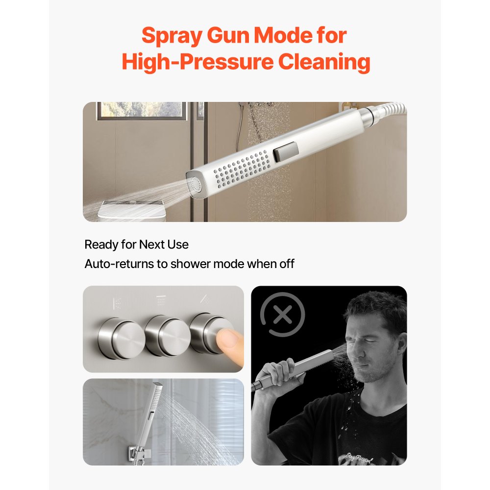 Σύστημα ντους 3 λειτουργιών: Το σετ βρύσης ντους μας περιλαμβάνει ντους χειρός, πλευρικό και πάνω από το κεφάλι 2 ρυθμίσεων. Τρία ανεξάρτητα κουμπιά και ένα κουμπί ελέγχου σάς επιτρέπουν να αλλάζετε τις ροές του νερού και να ρυθμίζετε τη θερμοκρασία. Ο σχεδιασμός του κρυφού σωλήνα δημιουργεί ένα μοντέρνο στυλ. Ντους χειρός 2 σε 1: Μέρος του συστήματος ντους μας, παρέχει λειτουργίες ντους και πιστολιού ψεκασμού. Το πίδακα υπό πίεση ξεπλένει τους τοίχους και τις μπανιέρες και στη συνέχεια επιστρέφει αυτόματα στη λειτουργία ντους για την αποφυγή ατυχημάτων. Ένας σωλήνας 4,9 ποδιών/1,5 μ. και η περιστρεφόμενη βάση εξασφαλίζουν καθαρισμό από πολλαπλές γωνίες. Εμπειρία ντους βροχής: Τόσο τα πλευρικά όσο και τα εναέρια ντους αυτού του συστήματος ντους βροχής υποστηρίζουν ρύθμιση γωνίας. Αναμιγνύοντας αέρα και νερό, προσφέρουν μια πλήρη ροή που προσομοιώνει την χαλαρωτική αίσθηση της φυσικής βροχής. Ανθεκτικό στην πίεση και χωρίς διαρροές: Αυτό το σύστημα ντους βροχής διαθέτει μια συμπαγή ορειχάλκινη βαλβίδα και μια κεραμική κασέτα εξισορρόπησης πίεσης, κατασκευασμένη για να αντέχει σε υψηλή πίεση νερού. Προσφέρει σταθερή ροή και είναι ανθεκτική στη διάβρωση, διατηρώντας το νερό σας καθαρό και ασφαλές. Εύκολη συντήρηση: Το σετ ντους μας διαθέτει ένα πάνελ από ανοξείδωτο ατσάλι 304, το οποίο είναι κομψό και ανθεκτικό στη διάβρωση. Τα εύκαμπτα ακροφύσια σιλικόνης σάς επιτρέπουν να τρίβετε τα άλατα για ομαλή ροή νερού.