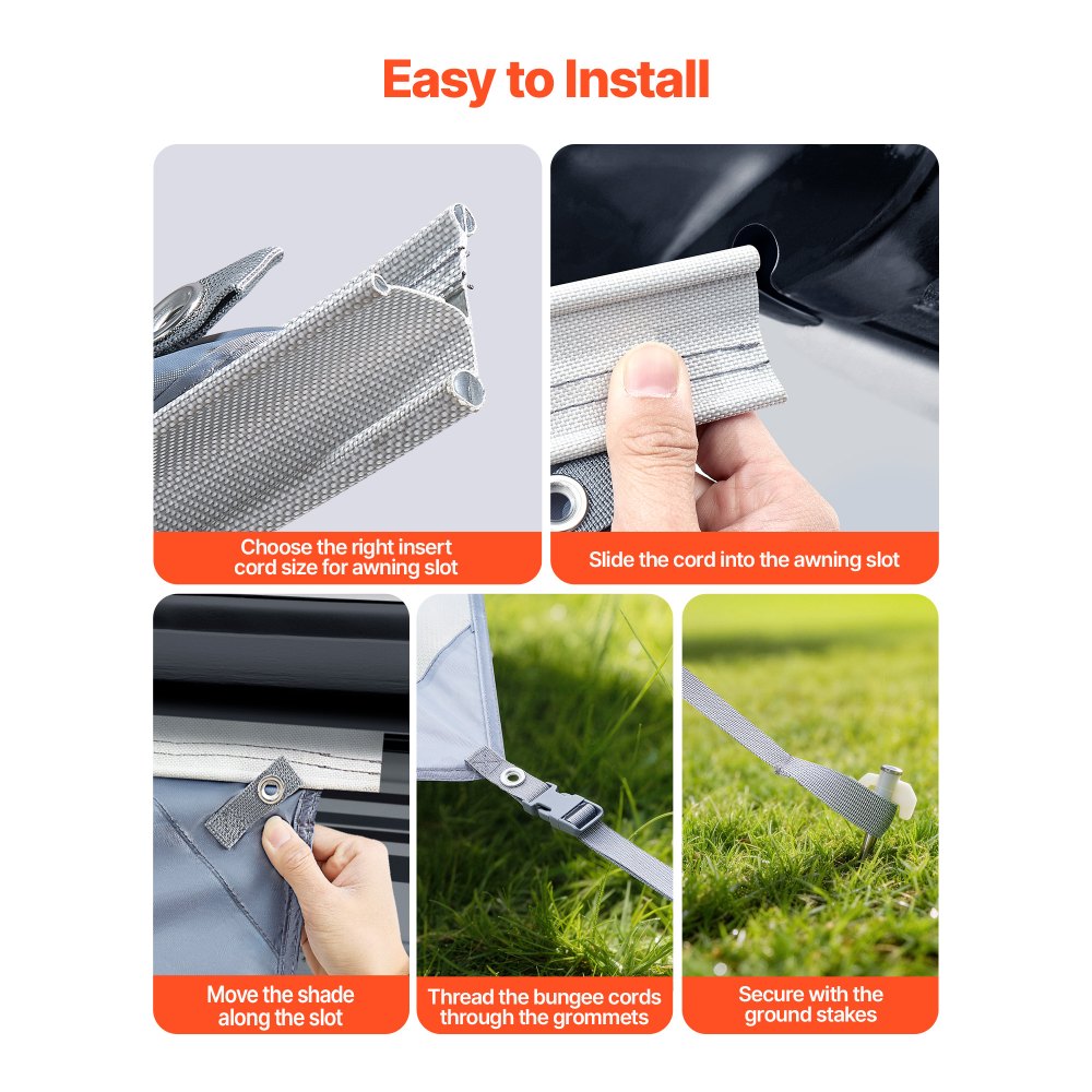 Λεπτομέρειες διαστάσεων: Μέγεθος κουρτίνας σκίασης: 2 x 3,3 μ., συμβατό με τέντες 3,5 μ. Μετρήστε προσεκτικά το μέγεθος της τέντας σας πριν από την αγορά για να βεβαιωθείτε για τη συμβατότητα. Αποτελεσματική σκίαση: Αφήστε την τέντα VEVOR RV να μπλοκάρει το έντονο ηλιακό φως και να μειώσει την αντανάκλαση, διατηρώντας παράλληλα καλό αερισμό - διατηρώντας τη σκιασμένη περιοχή σας πιο δροσερή και πιο άνετη για χαλάρωση και κάμπινγκ σε εξωτερικούς χώρους. Προστασία απορρήτου: Η σήτα από πλέγμα βοηθά επίσης στην απαλότητα της εξωτερικής θέας, προσφέροντας επιπλέον ιδιωτικότητα ενώ χαλαρώνετε ή κάνετε κάμπινγκ. Ταυτόχρονα, διατηρεί μια ανοιχτή και άνετη θέα από μέσα, δημιουργώντας έναν ιδιωτικό αλλά και αναπνεύσιμο χώρο χαλάρωσης. Ανθεκτικό και αξιόπιστο: Κατασκευασμένο με πλέγμα πολυεστέρα υψηλής πυκνότητας, διπλές ραφές και 4 ενισχυμένες γωνίες, αυτό το σκέπαστρο τέντας για τροχόσπιτα βοηθά στην αντοχή στο σκίσιμο και τη στρέβλωση για μακροχρόνια ανθεκτικότητα. Περιλαμβάνει επίσης 4 πασσάλους εδάφους για σταθερή και ασφαλή τοποθέτηση. Γρήγορη Εγκατάσταση & Ασφαλής Εφαρμογή: Διαθέτει τρεις διαμέτρους καλωδίου εισαγωγής (4,3 mm/6,2 mm/7 mm) για να ταιριάζει σε διαφορετικές ράγες τέντας RV, εξασφαλίζοντας άνετη εφαρμογή, ευκολότερη εγκατάσταση και πιο σταθερή τοποθέτηση. Περιλαμβάνονται τσάντες αποθήκευσης για συμπαγή αποθήκευση και μεταφορά που εξοικονομούν χώρο.