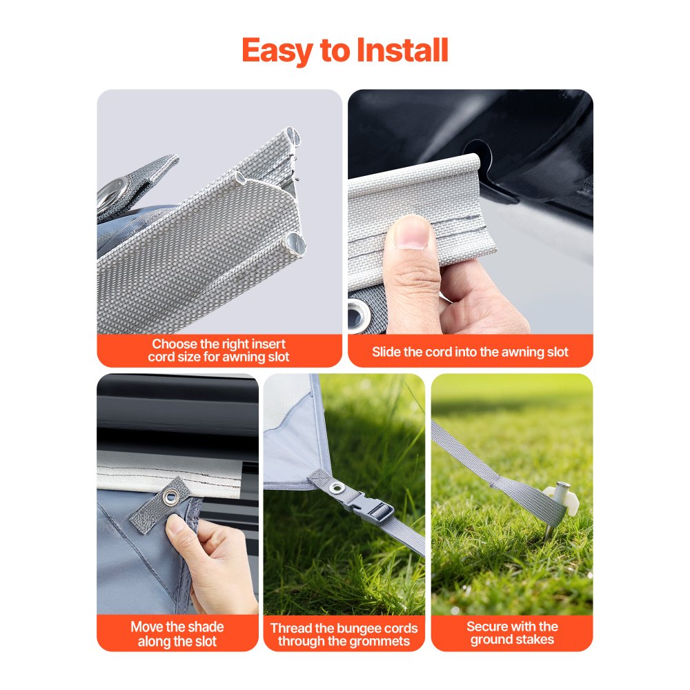 Λεπτομέρειες διαστάσεων: Μέγεθος κουρτίνας σκίασης: 2 x 4,3 μ., συμβατό με τέντες 4,5 μ. Μετρήστε προσεκτικά το μέγεθος της τέντας σας πριν από την αγορά για να βεβαιωθείτε για τη συμβατότητα. Αποτελεσματική σκίαση: Αφήστε την τέντα VEVOR RV να μπλοκάρει το έντονο ηλιακό φως και να μειώσει την αντανάκλαση, διατηρώντας παράλληλα καλό αερισμό - διατηρώντας τη σκιασμένη περιοχή σας πιο δροσερή και πιο άνετη για χαλάρωση και κάμπινγκ σε εξωτερικούς χώρους. Προστασία απορρήτου: Η σήτα από πλέγμα βοηθά επίσης στην απαλότητα της εξωτερικής θέας, προσφέροντας επιπλέον ιδιωτικότητα ενώ χαλαρώνετε ή κάνετε κάμπινγκ. Ταυτόχρονα, διατηρεί μια ανοιχτή και άνετη θέα από μέσα, δημιουργώντας έναν ιδιωτικό αλλά και αναπνεύσιμο χώρο χαλάρωσης. Ανθεκτικό και αξιόπιστο: Κατασκευασμένο με πλέγμα πολυεστέρα υψηλής πυκνότητας, διπλές ραφές και 4 ενισχυμένες γωνίες, αυτό το σκέπαστρο τέντας για τροχόσπιτα βοηθά στην αντοχή στο σκίσιμο και τη στρέβλωση για μακροχρόνια ανθεκτικότητα. Περιλαμβάνει επίσης 4 πασσάλους εδάφους για σταθερή και ασφαλή τοποθέτηση. Γρήγορη Εγκατάσταση & Ασφαλής Εφαρμογή: Διαθέτει τρεις διαμέτρους καλωδίου εισαγωγής (4,3 mm/6,2 mm/7 mm) για να ταιριάζει σε διαφορετικές ράγες τέντας RV, εξασφαλίζοντας άνετη εφαρμογή, ευκολότερη εγκατάσταση και πιο σταθερή τοποθέτηση. Περιλαμβάνονται τσάντες αποθήκευσης για συμπαγή αποθήκευση και μεταφορά που εξοικονομούν χώρο.