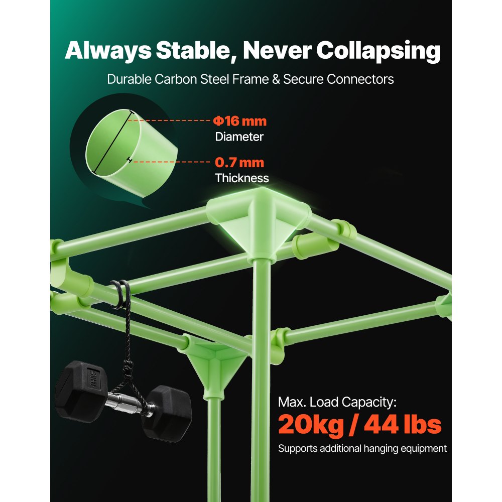 Χωρητικότητα βάρους: 20 κιλά / 44 λίβρεςΔιαστάσεις σκηνής: 400 x 400 x 1600 mm/ 15,7 x 15,7 x 63,0 inΜέγεθος θύρας καλωδίου: 102 mm/ 4 inΘύρες εξαερισμού: 3 θύρες, 152 mm / 6 ίντσες η καθεμίαΧρώμα: Μαύρο + ΠράσινοΥλικό αντικειμένου: Ύφασμα Oxford 600D, Ανακλαστική μεμβράνη πολυεστέρα, Χάλυβας άνθρακα, PP