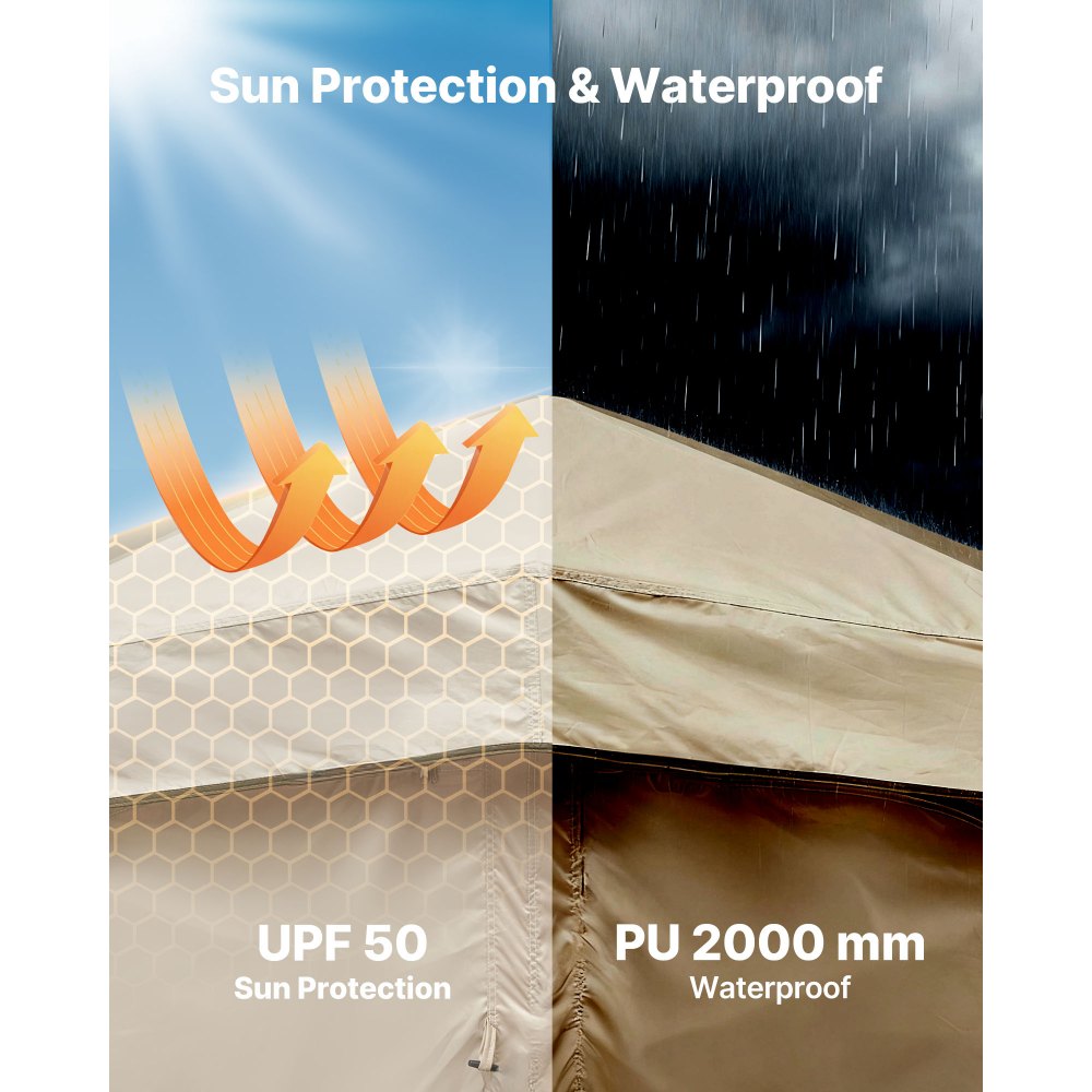 Ασφάλεια και προστασία απορρήτου: Όταν κάνετε ντους ή αλλάζετε ρούχα σε εξωτερικό χώρο, και τα δύο έχουν σημασία. Το παχύ εξωτερικό ύφασμα και το πλαίσιο από υαλοβάμβακα διατηρούν τη σκηνή ντους κάμπινγκ σταθερή στον αέρα ή τη βροχή, ενώ ο αερισμός και η εσωτερική αποθήκευση προσθέτουν άνεση σαν στο σπίτι. Εύκολη εγκατάσταση και δίπλωση: Ο σχεδιασμός γρήγορης αναδίπλωσης σάς επιτρέπει να διπλώνετε γρήγορα τη σκηνή ντους, μειώνοντας το μέγεθός της για εύκολη αποθήκευση χωρίς να καταλαμβάνετε χώρο. Η εγκατάσταση είναι εξίσου απλή—δεν απαιτούνται ειδικές δεξιότητες και ακόμη και οι αρχάριοι μπορούν να τη συναρμολογήσουν εύκολα. Ευρύχωρος σχεδιασμός 2 δωματίων: Ο χώρος 84,25 x 44,09 x 83,86 ίντσες επιτρέπει σε δύο άτομα να χρησιμοποιούν την εξωτερική σκηνή ντους ταυτόχρονα. Η διπλή διάταξη υποστηρίζει τον διαχωρισμό ξηρού-υγρού, επιτρέποντάς σας να κάνετε ντους στη μία περιοχή ενώ στεγνώνεστε ή αλλάζετε ρούχα στην άλλη. Προστασία από τον ήλιο και αντοχή στο νερό: Κατασκευασμένη από ύφασμα Oxford 150D με προστασία UPF 50, η σκηνή απορρήτου μας μπλοκάρει το έντονο ηλιακό φως. Τα πλαϊνά παράθυρα βελτιώνουν τη ροή του αέρα. Η αντοχή στο νερό PU2000mm επιτρέπει στη βροχή να γλιστράει γρήγορα, διατηρώντας το εσωτερικό στεγνό. Πολλαπλές επιλογές αποθήκευσης: Αυτή η φορητή σκηνή ντους προσφέρει άνεση σε εξωτερικούς χώρους, σαν στο σπίτι. Το πάνω γάντζο χωράει ένα φως ή κεφαλή ντους, η τσέπη αποθήκευσης διατηρεί τα τηλέφωνα και τα μικρά αντικείμενα οργανωμένα και η τσάντα με χαρτομάντιλα προσθέτει επιπλέον άνεση.