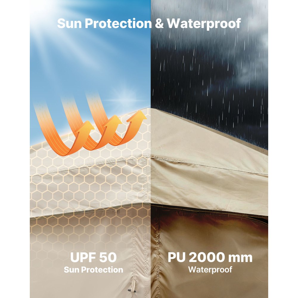 Ασφάλεια και προστασία απορρήτου: Όταν κάνετε ντους ή αλλάζετε ρούχα σε εξωτερικό χώρο, και τα δύο έχουν σημασία. Το παχύ εξωτερικό ύφασμα και το πλαίσιο από υαλοβάμβακα διατηρούν τη σκηνή ντους κάμπινγκ σταθερή στον αέρα ή τη βροχή, ενώ ο αερισμός και η εσωτερική αποθήκευση προσθέτουν άνεση σαν στο σπίτι. Εύκολη εγκατάσταση και δίπλωση: Ο σχεδιασμός γρήγορης αναδίπλωσης σάς επιτρέπει να διπλώνετε γρήγορα τη σκηνή ντους, μειώνοντας το μέγεθός της για εύκολη αποθήκευση χωρίς να καταλαμβάνετε χώρο. Η εγκατάσταση είναι εξίσου απλή—δεν απαιτούνται ειδικές δεξιότητες και ακόμη και οι αρχάριοι μπορούν να τη συναρμολογήσουν εύκολα. Ευρύχωρος σχεδιασμός 2 δωματίων: Ο χώρος 98,43 x 48,03 x 85,83 ίντσες επιτρέπει σε δύο άτομα να χρησιμοποιούν την εξωτερική σκηνή ντους ταυτόχρονα. Η διπλή διάταξη υποστηρίζει τον διαχωρισμό ξηρού-υγρού, επιτρέποντάς σας να κάνετε ντους στη μία περιοχή ενώ στεγνώνεστε ή αλλάζετε ρούχα στην άλλη. Προστασία από τον ήλιο και αντοχή στο νερό: Κατασκευασμένη από ύφασμα Oxford 150D με προστασία UPF 50, η σκηνή απορρήτου μας μπλοκάρει το έντονο ηλιακό φως. Τα πλαϊνά παράθυρα βελτιώνουν τη ροή του αέρα. Η αντοχή στο νερό PU2000mm επιτρέπει στη βροχή να γλιστράει γρήγορα, διατηρώντας το εσωτερικό στεγνό. Πολλαπλές επιλογές αποθήκευσης: Αυτή η φορητή σκηνή ντους προσφέρει άνεση σε εξωτερικούς χώρους, σαν στο σπίτι. Το σκοινί απλώματος κρεμάει πετσέτες και ρούχα, το πάνω γάντζο κρατάει ένα φως ή κεφαλή ντους και η τσέπη αποθήκευσης κρατάει τα τηλέφωνα και τα μικρά αντικείμενα οργανωμένα.