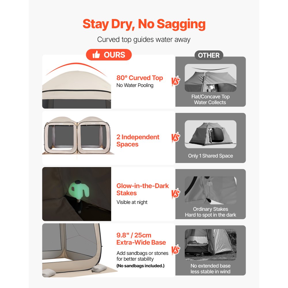 Ευρύχωρο και χαλαρωτικό καταφύγιο: Απολαύστε έναν ευρύχωρο εξωτερικό χώρο όπου η οικογένεια και οι φίλοι μπορούν να συγκεντρωθούν και να χαλαρώσουν. Η σκηνή μας με σήτα χωράει άνετα έως και 10 άτομα χωρίς να νιώθετε στριμωγμένοι, καθιστώντας την ιδανική για διασκέδαση στην αυλή, για μέρες στην παραλία ή για χαλαρές εκδρομές κάμπινγκ. Σταθερή και αντιανεμική δομή: Οι ενισχυμένοι στύλοι από υαλοβάμβακα και χάλυβα διατηρούν την σκηνή με αναδιπλούμενη οθόνη σε όρθια θέση ακόμα και σε συνθήκες ανέμου. Ο καμπυλωτός σχεδιασμός της πάνω πλευράς αποτρέπει τη συγκέντρωση και το κρέμασμα του νερού. Γρήγορη εγκατάσταση και εύκολη αποθήκευση: Ο αναδιπλούμενος σχεδιασμός με αποσπώμενους στύλους επιτρέπει την εγκατάσταση σε δευτερόλεπτα χωρίς εργαλεία. Το αναδιπλούμενο σπίτι μας διπλώνει εύκολα σε μια τσάντα μεταφοράς για βολική μεταφορά και αποθήκευση. Προστασία από τσιμπήματα και καιρικές συνθήκες: Το πλέγμα υψηλής πυκνότητας 360° κρατά τα τσιμπήματα μακριά, ενώ το ύφασμα Oxford 300D με αδιάβροχη και αντηλιακή προστασία σας προστατεύει από τον ήλιο και τη βροχή. Μείνετε δροσεροί και άνετοι με το αναδιπλούμενο σήτα δωματίου μας. Πλήρες κιτ αξεσουάρ: Αυτό το φορητό στέγαστρο δωματίου με οθόνη περιλαμβάνει 16 πασσάλους εδάφους, 4 στύλους από υαλοβάμβακα, 2 ιμάντες, 1 τσάντα μεταφοράς σκηνής, 1 τσάντα αποθήκευσης πασσάλων, 1 τσάντα αποθήκευσης στύλων και 1 εγχειρίδιο χρήστη - όλα όσα χρειάζεστε για γρήγορη εγκατάσταση και ασφαλή χρήση.