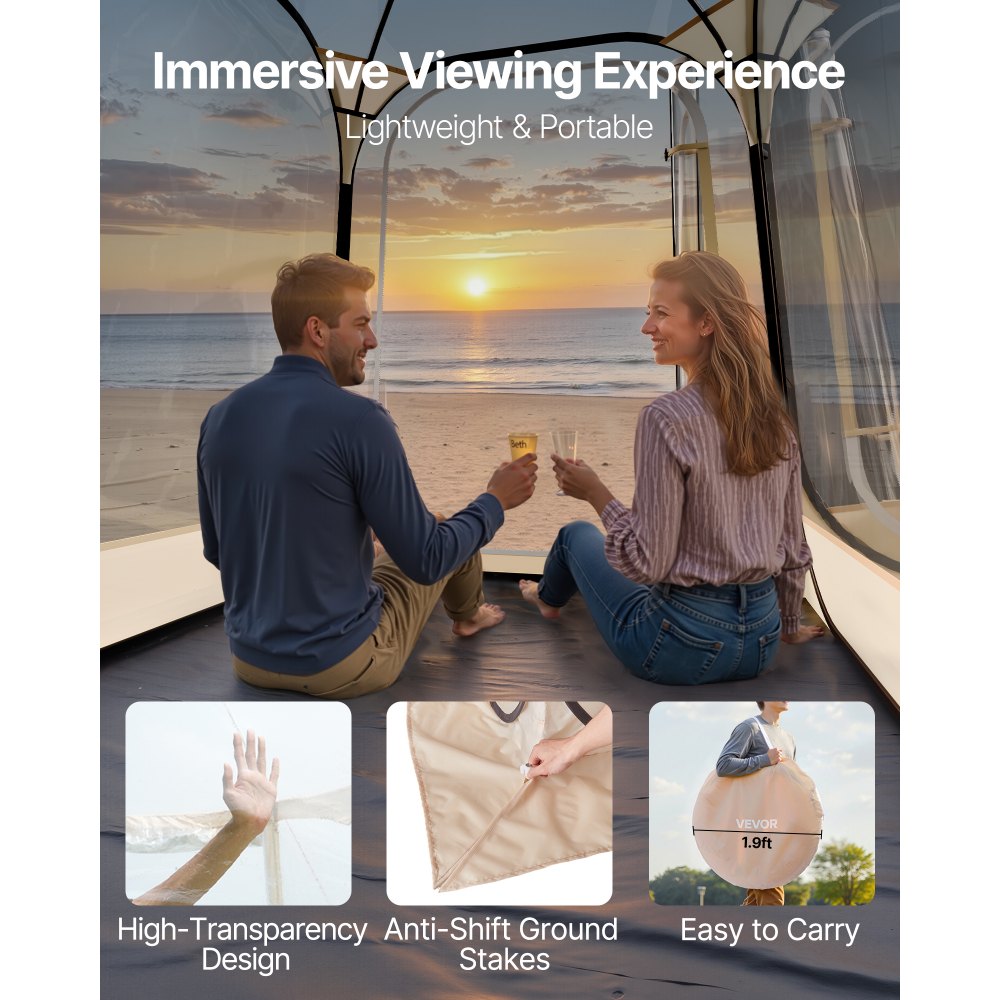 Γρήγορη αναδυόμενη σκηνή σε δευτερόλεπτα: Η διαφανής αθλητική σκηνή διαθέτει αναδυόμενο σχεδιασμό που επιτρέπει την εύκολη εγκατάσταση σε λιγότερο από ένα λεπτό—δεν απαιτούνται πολύπλοκα βήματα, κάνοντας την κατασκήνωση σε εξωτερικούς χώρους πιο βολική. Σημείωση: Αυτή η αναδυόμενη σκηνή είναι κατάλληλη για δροσερό φθινόπωρο και χειμώνα, δεν συνιστάται για ζεστό καιρό. Ολοκληρωμένη προστασία: Εξοπλισμένο με παράθυρα εξαερισμού, αφαιρούμενο πατάκι δαπέδου από PE και κάλυμμα βροχής, το αθλητικό μας pod εξασφαλίζει σωστή ροή αέρα διατηρώντας παράλληλα τη σκηνή αδιάβροχη και ανθεκτική στην υγρασία. Ανθεκτικό και στιβαρό: Κατασκευασμένο με πλαστικό TPU υψηλής αντοχής, ύφασμα 210D Oxford και ατσάλινο σκελετό για αντοχή στο σκίσιμο και προστασία από την υπεριώδη ακτινοβολία, το αναδιπλούμενο και ανθεκτικό στις καιρικές συνθήκες pod εξασφαλίζει μακροχρόνια ανθεκτικότητα. Εξαιρετική κατασκευή: Αυτή η αναδιπλούμενη σκηνή με φούσκες διαθέτει θερμικά σφραγισμένες ραφές και διπλή ραφή, με αναβαθμισμένα φερμουάρ SBS για ενίσχυση της στεγανοποίησης και της ανθεκτικότητας, βελτιώνοντας τη συνολική μακροζωία. Προσεγμένα αξεσουάρ: Η διάφανη αθλητική σκηνή με φούσκα περιλαμβάνει 4 πασσάλους που λάμπουν στο σκοτάδι, 4 σχοινιά αντιανεμικού και μια βολική τσάντα μεταφοράς για εύκολη αποθήκευση και φορητότητα. Οι ανακλαστικοί πασσάλοι εξασφαλίζουν ορατότητα τη νύχτα και αντοχή στον αέρα για πρόσθετη ασφάλεια. Η αναδιπλούμενη σκηνή μας προστατεύεται από αίτηση ευρεσιτεχνίας σχεδιασμού στις ΗΠΑ (Αριθμός **US30006657**).