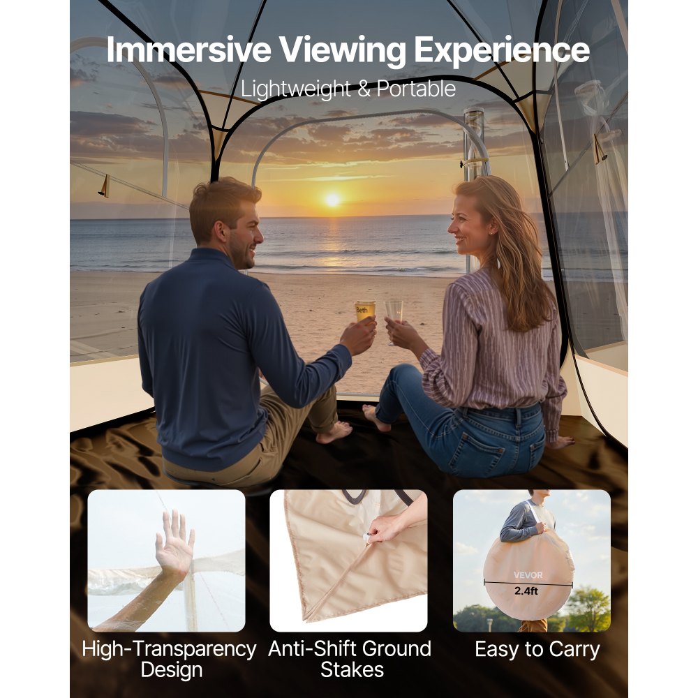 Αναδιπλούμενη διαφανής δομή: Στήστε γρήγορα την αναδιπλούμενη σκηνή σε δευτερόλεπτα με τον βολικό αναδιπλούμενο σχεδιασμό. Η διαφανής σκηνή με φυσαλίδες προσφέρει πανοραμική θέα 360° της φύσης, κάνοντας τις υπαίθριες εμπειρίες πιο καθηλωτικές. Σημείωση: Αυτή η αναδιπλούμενη σκηνή είναι κατάλληλη για δροσερό φθινόπωρο και χειμώνα, δεν συνιστάται για ζεστό καιρό. Διπλά τυλιγόμενα παράθυρα: Η σκηνή ποδοσφαίρου μας διαθέτει δύο τυλιγόμενα παράθυρα που σας επιτρέπουν να ρυθμίζετε εύκολα τη ροή του αέρα και να ελέγχετε την ιδιωτικότητα, εξασφαλίζοντας ένα άνετο και χαλαρωτικό περιβάλλον. Υλικά υψηλής αντοχής: Κατασκευασμένα από πλαστικό TPU υψηλής ποιότητας και ύφασμα 210D Oxford με ανθεκτική στήριξη από ατσάλινο σύρμα. Το ανθεκτικό στις καιρικές συνθήκες pod μας είναι ανθεκτικό στη φθορά και προστατεύει από την υπεριώδη ακτινοβολία, διατηρώντας τη δομή σταθερή και μακράς διαρκείας. Αδιάβροχη και αντιανεμική: Αυτή η διαφανής αθλητική σκηνή με φούσκα διαθέτει θερμοκολλημένες ραφές, διπλή ραφή και αναβαθμισμένα φερμουάρ SBS για ανώτερη αδιαβροχοποίηση. Κατασκευασμένη για να αντιμετωπίζει τις μεταβαλλόμενες εξωτερικές συνθήκες με σιγουριά. Πλήρη αξεσουάρ: Η σκηνή καιρού για εξωτερικές αθλητικές δραστηριότητες διαθέτει 4 πασσάλους που λάμπουν στο σκοτάδι, 4 σχοινιά ανέμου και μια φορητή τσάντα μεταφοράς. Εύκολη στη μεταφορά, ασφαλίζει στον άνεμο και είναι έτοιμη για οποιαδήποτε υπαίθρια περιπέτεια. Η αναδιπλούμενη σκηνή μας προστατεύεται από αίτηση ευρεσιτεχνίας σχεδιασμού στις ΗΠΑ (Αριθμός **US30006657**).