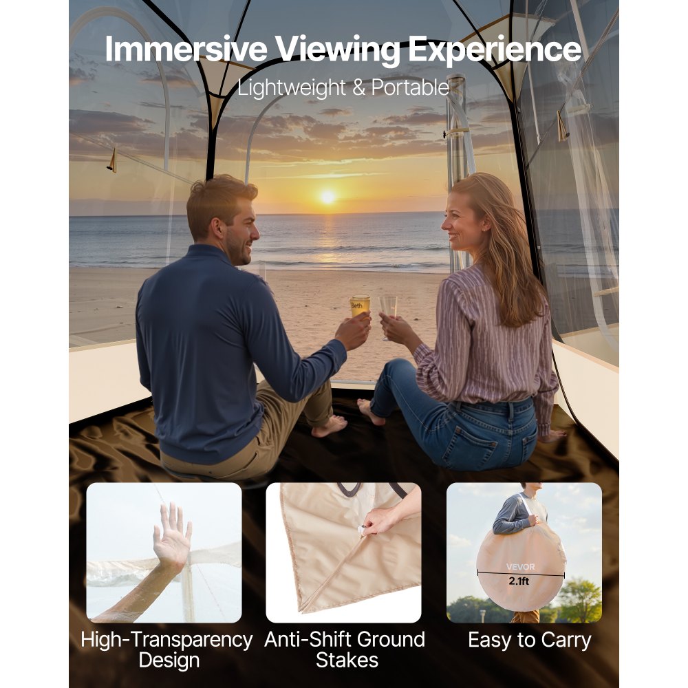 Αναδιπλούμενος Διαφανής Σχεδιασμός: Η διαφανής αθλητική σκηνή διαθέτει εύχρηστο αναδιπλούμενο σχεδιασμό που επιτρέπει γρήγορη εγκατάσταση σε λίγα μόνο δευτερόλεπτα. Το διαφανές, ανθεκτικό στις καιρικές συνθήκες pod μας προσφέρει έναν φωτεινό και ευάερο εξωτερικό χώρο για να τον απολαύσετε σε χρόνο μηδέν. Σημείωση: Αυτή η αναδιπλούμενη σκηνή είναι κατάλληλη για δροσερό φθινόπωρο και χειμώνα, δεν συνιστάται για ζεστό καιρό. Σχεδιασμός διπλού τυλιγόμενου παραθύρου: Εξοπλισμένη με δύο τυλιγόμενα παράθυρα, η αναδιπλούμενη σκηνή με φυσαλίδες ρυθμίζει εύκολα τη ροή του αέρα, εξασφαλίζοντας παράλληλα ιδιωτικότητα και άνεση κατά τη χρήση. Ανθεκτική και στιβαρή: Κατασκευασμένη από υλικά υψηλής αντοχής που είναι ανθεκτικά στο σκίσιμο και προστατεύονται από την υπεριώδη ακτινοβολία, η αναδιπλούμενη σκηνή με φυσαλίδες μας εξασφαλίζει μακροχρόνια ανθεκτικότητα και απόδοση σε διάφορες εξωτερικές συνθήκες. Αναβαθμισμένα φερμουάρ για αδιαβροχοποίηση Κατασκευασμένες με λεπτότητα για να εξασφαλίζουν εξαιρετική αδιάβροχη απόδοση, οι σκηνές βροχής για αθλήματα είναι ιδανικές για προσαρμογή σε απρόβλεπτα εξωτερικά περιβάλλοντα.