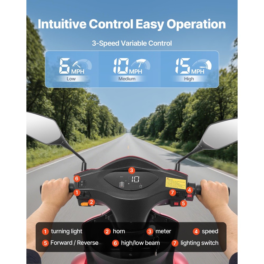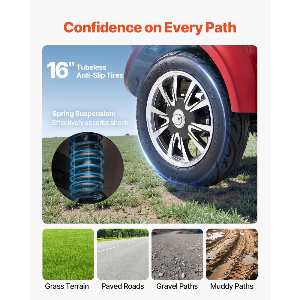 Σταθερή Οδήγηση: Το ανθεκτικό μας τετράτροχο σκούτερ κινητικότητας τροφοδοτείται από μια επαναφορτιζόμενη μπαταρία μολύβδου-οξέος 60V 20A, προσφέροντας μακροχρόνια απόδοση με αυτονομία έως και 35 km / 21,5 mi ανά πλήρη φόρτιση. Τα ελαστικά με βαθύ πέλμα και χωρίς φούσκωμα κάνουν την οδήγηση ευκολότερη και πιο σταθερή, ενώ η μπροστινή και η πίσω ανάρτηση με ελατήρια απορροφούν τους κραδασμούς, εξασφαλίζοντας ισορροπημένη διαδρομή και βοηθώντας σας να φτάσετε στον προορισμό σας με ευκολία. Ισχυρή Απόδοση: Αυτό το σκούτερ κινητικότητας για ενήλικες και ηλικιωμένους είναι εξοπλισμένο με κινητήρα χωρίς ψήκτρες υψηλής ροπής 1000W που δεν απαιτεί συντήρηση και προσφέρει μεγαλύτερη διάρκεια ζωής. Η υψηλή ισχύς του εξασφαλίζει εξαιρετική ικανότητα φόρτωσης, υποστηρίζοντας έως και 226,8 κιλά, επομένως η απόδοση δεν περιορίζεται από το βάρος του αναβάτη. Ευελιξία 3 ταχυτήτων: Το ηλεκτρικό σκούτερ αναψυχής μας διαθέτει τρεις ρυθμιζόμενες λειτουργίες ταχύτητας (6 MPH / 10 MPH / 15 MPH), επιτρέποντάς σας να προσαρμόζεστε ανάλογα με τις ανάγκες. Είτε για ψώνια είτε για βόλτες σε γραφικά μέρη, αποτελεί ιδανική επιλογή για ηλικιωμένους. Ο πίνακας ελέγχου εμφανίζει με σαφήνεια την ταχύτητα, τα χιλιόμετρα και την κατάσταση της μπαταρίας σε πραγματικό χρόνο. Άνετος σχεδιασμός: Αυτό το ανθεκτικό σκούτερ κινητικότητας για ενήλικες διαθέτει πλάτη καθίσματος που μπορεί να ρυθμιστεί προς τα εμπρός και προς τα πίσω, αφήνοντας άφθονο χώρο για τα πόδια. Διαθέτει επίσης προσκέφαλο για πρόσθετη άνεση και στήριξη. Και τα δύο υποβραχιόνια μπορούν να ανυψωθούν ή να αναστραφούν για εύκολη επιβίβαση και αποβίβαση. Ένα πίσω κουτί αποθήκευσης και μια θήκη στο ταμπλό παρέχουν άνετο χώρο για καθημερινές εξόδους και ψώνια. Πρώτα η ασφάλεια: Το ηλεκτρικό μας σκούτερ για ενήλικες είναι εξοπλισμένο με διπλά μπροστινά και πίσω φρένα για αξιόπιστη ισχύ φρεναρίσματος. Το σύστημα ανάρτησης σας βοηθά να διαχειρίζεστε εύκολα άμμο, γρασίδι, λάσπη και σαμαράκια. Ένας πίσω τροχός με αντικραδασμική προστασία προσθέτει επιπλέον σταθερότητα, ενώ το πλήρες σύστημα φωτισμού (μεγάλη/μεσαία σκάλα, πίσω φως, φλας και φως φρένων), οι καθρέφτες οπισθοπορείας, η ζώνη ασφαλείας και το τηλεχειριστήριο του αντικλεπτικού συναγερμού εξασφαλίζουν ασφαλείς διαδρομές. Ένας συναγερμός όπισθεν με ηχητικές υποδείξεις παρέχει πρόσθετη προστασία κατά την όπισθεν.