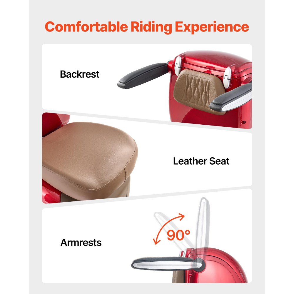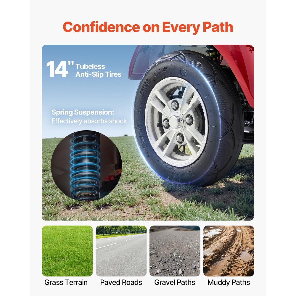 Σταθερή Οδήγηση: Το ανθεκτικό μας τετράτροχο σκούτερ κινητικότητας τροφοδοτείται από μια επαναφορτιζόμενη μπαταρία μολύβδου-οξέος 60V 20A, προσφέροντας μακροχρόνια απόδοση με αυτονομία έως και 35 km / 21,5 mi ανά πλήρη φόρτιση. Τα ελαστικά με βαθύ πέλμα και χωρίς φούσκωμα κάνουν την οδήγηση ευκολότερη και πιο σταθερή, ενώ η μπροστινή και η πίσω ανάρτηση με ελατήρια απορροφούν τους κραδασμούς, εξασφαλίζοντας ισορροπημένη διαδρομή και βοηθώντας σας να φτάσετε στον προορισμό σας με ευκολία. Ισχυρή Απόδοση: Αυτό το σκούτερ κινητικότητας για ενήλικες και ηλικιωμένους είναι εξοπλισμένο με κινητήρα χωρίς ψήκτρες υψηλής ροπής 1000W που δεν απαιτεί συντήρηση και προσφέρει μεγαλύτερη διάρκεια ζωής. Η υψηλή ισχύς του εξασφαλίζει εξαιρετική ικανότητα φόρτωσης, υποστηρίζοντας έως και 226,8 κιλά, επομένως η απόδοση δεν περιορίζεται από το βάρος του αναβάτη. Ευελιξία 3 ταχυτήτων: Το ηλεκτρικό σκούτερ αναψυχής μας διαθέτει τρεις ρυθμιζόμενες λειτουργίες ταχύτητας (6 MPH / 10 MPH / 15 MPH), επιτρέποντάς σας να προσαρμόζεστε ανάλογα με τις ανάγκες. Είτε για ψώνια είτε για βόλτες σε γραφικά μέρη, αποτελεί ιδανική επιλογή για ηλικιωμένους. Ο πίνακας ελέγχου εμφανίζει με σαφήνεια την ταχύτητα, τα χιλιόμετρα και την κατάσταση της μπαταρίας σε πραγματικό χρόνο. Άνετος σχεδιασμός: Αυτό το στιβαρό σκούτερ κινητικότητας για ενήλικες διαθέτει κάθισμα με υποστηρικτική πλάτη. Και τα δύο υποβραχιόνια μπορούν να ρυθμιστούν προς τα πάνω ή προς τα πίσω για εύκολη επιβίβαση και αποβίβαση. Ένα πίσω κουτί αποθήκευσης και μια μπροστινή θήκη στο ταμπλό παρέχουν πρακτικό χώρο για καθημερινές εξόδους και αγορές. Πρώτα η ασφάλεια: Το ηλεκτρικό μας σκούτερ για ενήλικες είναι εξοπλισμένο με διπλά μπροστινά και πίσω φρένα για αξιόπιστη ισχύ φρεναρίσματος. Το σύστημα ανάρτησης σας βοηθά να διαχειρίζεστε εύκολα άμμο, γρασίδι, λάσπη και σαμαράκια. Ένας πίσω τροχός με αντικραδασμική προστασία προσθέτει επιπλέον σταθερότητα, ενώ το πλήρες σύστημα φωτισμού (μεγάλη/μεσαία σκάλα, πίσω φως, φλας και φως φρένων), οι καθρέφτες οπισθοπορείας, η ζώνη ασφαλείας και το τηλεχειριστήριο του αντικλεπτικού συναγερμού εξασφαλίζουν ασφαλείς διαδρομές. Ένας συναγερμός όπισθεν με ηχητικές υποδείξεις παρέχει πρόσθετη προστασία κατά την όπισθεν.