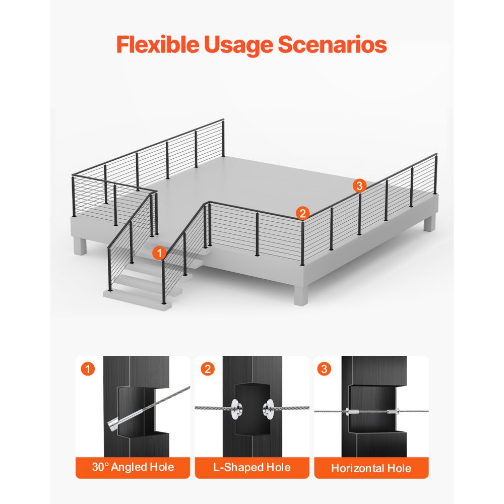 Στύλος κιγκλιδώματος καλωδίου με οπή τύπου L: Αυτός ο στύλος κιγκλιδώματος καλωδίου με οπή τύπου L 42 ιντσών έχει σχεδιαστεί ειδικά για γωνίες. Διαθέτει προ-τρυπημένες 12 ζεύγη οπών τύπου L, κατάλληλες για χρήση σε οριζόντια τμήματα ή ως τελικός στύλος για οριζόντιες γωνιακές κατασκευές. Σημείωση: Αυτό το προϊόν δεν περιλαμβάνει συρματόσχοινα. Ανθεκτικό και Στιβαρό: Ο στύλος χειρολισθήρα καλωδίων μας είναι κατασκευασμένος από ανοξείδωτο χάλυβα SUS304 υψηλής ποιότητας, προσφέροντας εξαιρετική αντοχή στη σκουριά και προστασία από τη διάβρωση για μακροχρόνια ανθεκτικότητα. Ωστόσο, δεν συνιστάται για παράκτιες εφαρμογές. Συμμορφώνεται με τους κανονισμούς: Οι οπές τύπου L απέχουν 3" μεταξύ τους και, συνήθως, το άνοιγμα μεταξύ δύο δομικών στύλων δεν πρέπει να υπερβαίνει τα 4 πόδια για να περάσει η δοκιμή σφαίρας 4". Εύκολη εγκατάσταση και DIY: Αυτός ο στύλος κιγκλιδώματος καταστρώματος περιλαμβάνει οριζόντια και καμπύλα στηρίγματα, κατάλληλα για διάφορους τύπους οπών σε στύλους κιγκλιδώματος. Είναι συμβατός με τετράγωνα και στρογγυλά κιγκλιδώματα από σωλήνες, επιτρέποντας την DIY προσαρμογή των γωνιών των κιγκλιδωμάτων. Προστασία πολλαπλών σκηνών: Ο στύλος μας για συρματόσχοινα είναι κατάλληλος τόσο για εσωτερική όσο και για εξωτερική προστασία, όπως καταστρώματα, σκάλες, βεράντες, φράχτες, αίθρια, μπαλκόνια, κήπους, οικιστικά κτίρια, εμπορικά γραφεία, ξενοδοχεία, γκαράζ και άλλα.