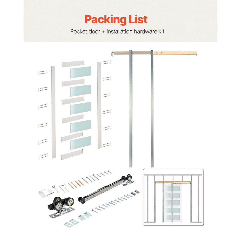 Διαστάσεις Πόρτας: Μέγεθος πάνελ πόρτας: 30"(Π) x 80"(Υ), πάχος: 1,38". Κατάλληλο για ανοίγματα 61" x 84,5". Περιλαμβάνει μία μόνο πόρτα τσέπης και ένα πλήρες κιτ εξοπλισμού εγκατάστασης. Καινοτόμος Σχεδιασμός: Με μοναδικό σχεδιασμό που σύρεται στον τοίχο και κρυφή εγκατάσταση, αυτή η συρόμενη πόρτα τσέπης εξοικονομεί σημαντικά χώρο χωρίς να χρειάζεται χώρο περιστροφής. Σε αντίθεση με τις πτυσσόμενες πόρτες και τις πόρτες του αχυρώνα που καταλαμβάνουν κάθετο / οριζόντιο χώρο, η πόρτα τσέπης μας μεγιστοποιεί την απόδοση του χώρου. Ανθεκτική και στιβαρή: Κατασκευασμένη με στιβαρό πλαίσιο από μασίφ ξύλο και MDF, η συρόμενη πόρτα τσέπης μας προσφέρει εξαιρετική σταθερότητα και ανθεκτικότητα. Η αδιάβροχη επιφάνεια καθαρίζεται εύκολα, ενώ το αδιαβροχοποιημένο γυαλί 5-Lite είναι ανθεκτικό στις θραύσεις και τις γρατσουνιές, παρέχοντας φυσικό φως, προστατεύοντας παράλληλα την ιδιωτικότητα. Αθόρυβη & Ομαλή Ολίσθηση: Εξοπλισμένη με πάνω από 100.000 ρουλεμάν δοκιμασμένα σε κύλιση, μεταλλικά μέρη υψηλής ποιότητας, τρίτροχες κρεμάστρες, ανθεκτικούς οδηγούς πόρτας και ράγα, η τσέπη μας ολισθαίνει αθόρυβα και ομαλά. Εύκολη στο σπρώξιμο και το τράβηγμα, αποτρέπει τα χτυπήματα και τις συγκρούσεις, προστατεύοντας παράλληλα τους τοίχους από ζημιές. Ευρείες εφαρμογές: Είτε πρόκειται για την κρεβατοκάμαρα, το μπάνιο, την κουζίνα ή το γραφείο, αυτή η κομψή συρόμενη πόρτα τσέπης συνδυάζεται άψογα με τη διακόσμηση του σπιτιού σας, βελτιώνοντας την αποδοτικότητα του χώρου, προσθέτοντας παράλληλα λειτουργικότητα και ομορφιά στο σπίτι σας.