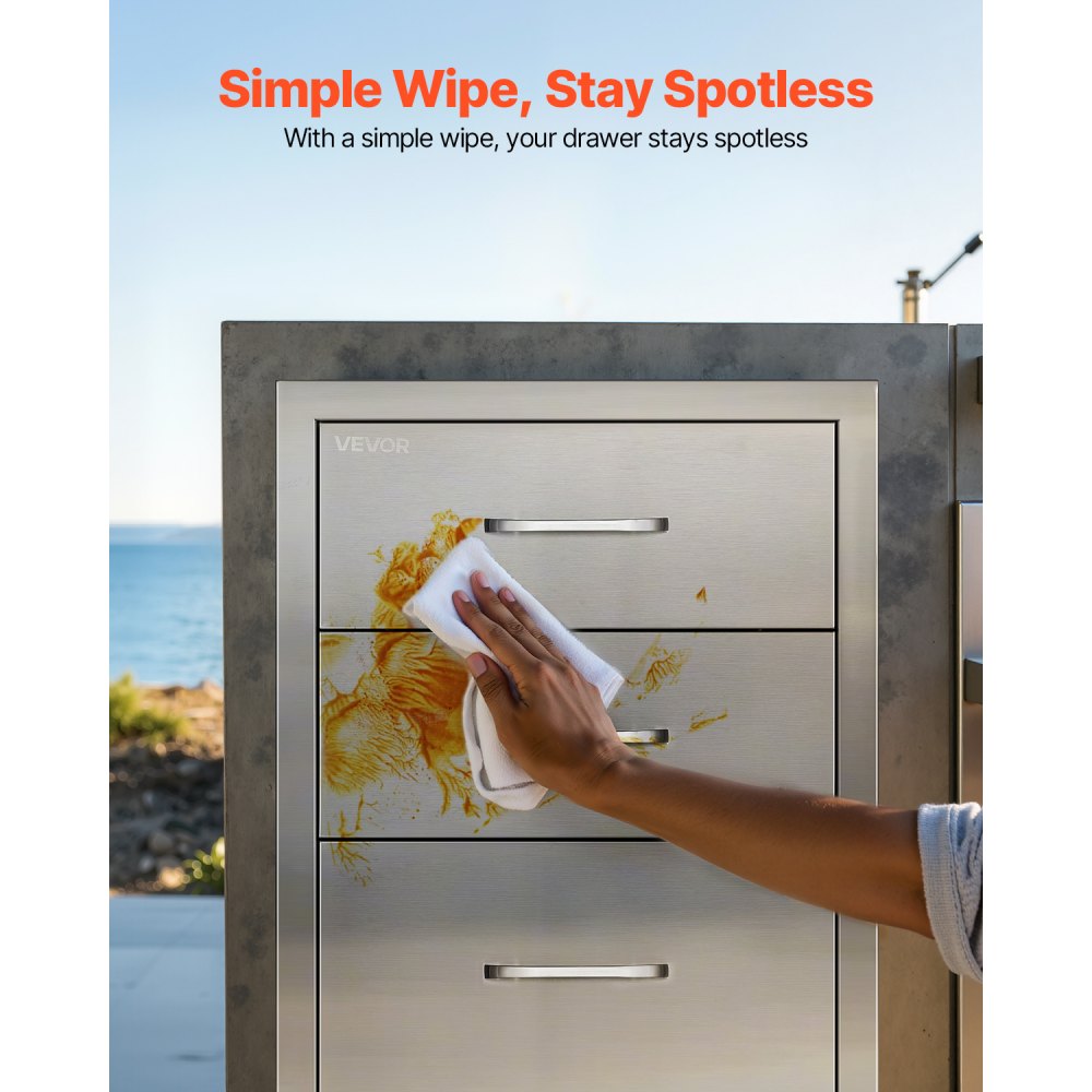 Μεγάλη χωρητικότητα αποθήκευσης: Το εξωτερικό συρτάρι κουζίνας έχει διαστάσεις 18,11"Π x 23,23"Β x 23,23"Υ, με δύο μικρά συρτάρια (6,30"Π x 20,47"Β x 15,55"Υ) και ένα μεγάλο συρτάρι (7,87"Π x 20,47"Β x 15,55"Υ), προσφέροντας άφθονο χώρο για αποτελεσματική και τακτοποιημένη αποθήκευση. Υλικό από ανοξείδωτο ατσάλι υψηλής ποιότητας: Τα συρτάρια εξωτερικού χώρου της κουζίνας μας είναι κατασκευασμένα από αδιάβροχο ανοξείδωτο ατσάλι που αντέχει στις υψηλές θερμοκρασίες. Το λείο, βουρτσισμένο φινίρισμα έχει υπέροχη εμφάνιση και επιτρέπει την εύκολη αφαίρεση των λεκέδων λαδιού για εύκολη συντήρηση. Ομαλές και Αθόρυβες Συρόμενες Ράγες: Αυτό το συρτάρι μπάρμπεκιου είναι εξοπλισμένο με ολισθητήρες 3 τμημάτων με ρουλεμάν για ομαλή και αθόρυβη λειτουργία. Πιο σταθερό από άλλα, κάθε συρτάρι μονής στρώσης συγκρατεί με ασφάλεια έως και 24,5 κιλά, αποτρέποντας το τρεμούλιασμα. Προσεγμένες λεπτομέρειες: Το συρτάρι μπάρμπεκιου από ανοξείδωτο ατσάλι διαθέτει στρογγυλεμένες γωνίες για την ελαχιστοποίηση των γρατσουνιών, μια αεροδυναμική λαβή 5 ιντσών για εύκολο άνοιγμα και άψογη κατασκευή για να διατηρεί το εσωτερικό στεγνό και ασφαλές. Ευρύ φάσμα εφαρμογών: Σχεδιασμένο για να αντέχει σε όλες τις καιρικές συνθήκες, συμπεριλαμβανομένου του ανέμου και της βροχής, αυτό το εξωτερικό συρτάρι αποθήκευσης είναι ιδανικό για εξωτερικές και εσωτερικές κουζίνες, νησίδες μπάρμπεκιου, μπαρ και ψησταριές. Ιδανικό για την αποθήκευση κάδων απορριμμάτων, φιάλων προπανίου και άλλων.