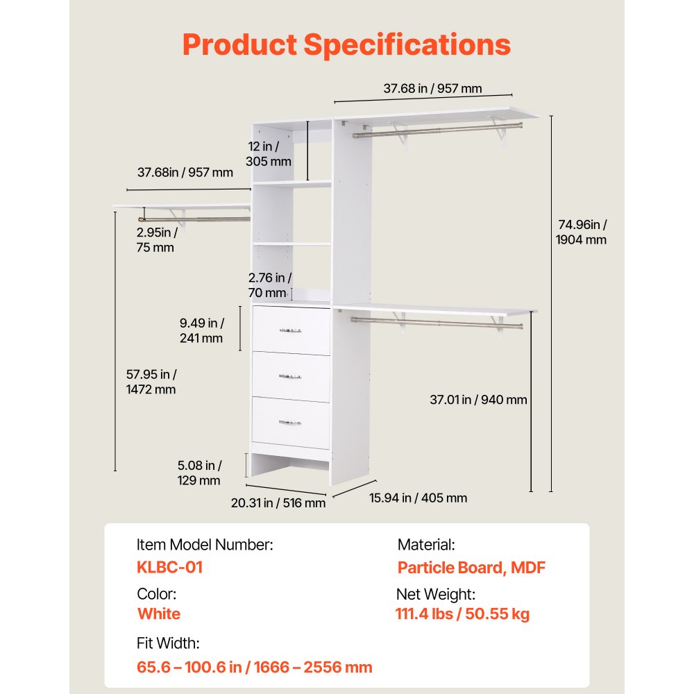 Ζωνική αποθήκευση: Το ξύλινο ράφι της ντουλάπας διαθέτει 12 διαμερίσματα για κρέμασμα, έκθεση ή στοίβαξη ρούχων, διευκολύνοντας την οργάνωση εποχιακών ρούχων και κλινοσκεπασμάτων για μια τριμελή οικογένεια ή ένα άτομο. Μεγάλη χωρητικότητα: Υποστηρίζοντας έως και 800 λίβρες / 362,7 κιλά, αυτό το σύστημα ντουλαπιών με συρτάρια μπορεί να χωρέσει περίπου 100 ρούχα. Χρησιμοποιήστε τα διαμερίσματά του για να διαχωρίσετε τα αντικείμενα με τάξη, διατηρώντας τα πάντα ορατά και εύκολα προσβάσιμα. Ρυθμιζόμενος σχεδιασμός: Η ράβδος ανάρτησης ρυθμίζεται από 22,6–40,2 ίντσες / 575–1020 mm και τα ράφια προσφέρουν 5 επίπεδα ύψους με βήματα 1,3 ίντσες / 32 mm. Περιλαμβάνει 3 συρτάρια που αφαιρούνται για ευέλικτη αποθήκευση. Ανθεκτική κατασκευή: Η ξύλινη θήκη οργάνωσης ντουλαπιών συνδυάζει μοριοσανίδες υψηλής αντοχής και πάνελ MDF ανθεκτικά στην υγρασία με φινίρισμα μελαμίνης, προσφέροντας εύκολο καθάρισμα και μακράς διαρκείας απόδοση. Ευέλικτη διαμόρφωση: Οι ράβδοι μπορούν να περιστραφούν ή να αφαιρεθούν για να ταιριάζουν στον χώρο της ντουλάπας σας. Οι πολλαπλές διατάξεις το καθιστούν κατάλληλο για υπνοδωμάτια, πλυσταριό ή γκαρνταρόμπες.