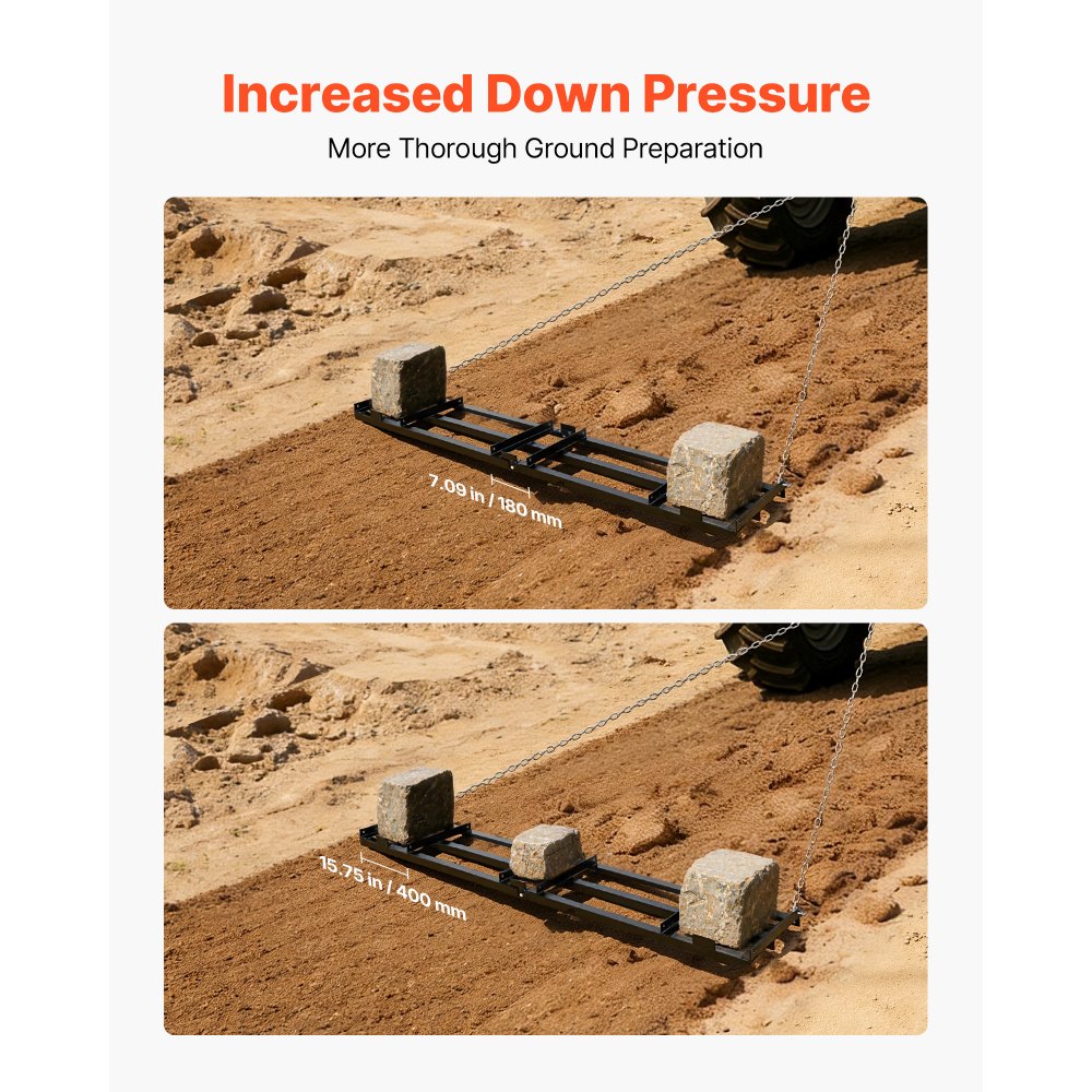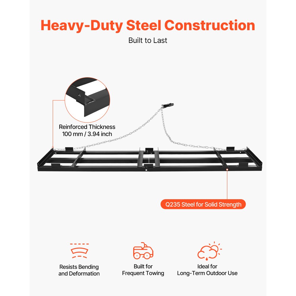 Υψηλής Απόδοσης Ισοπέδωση: Αυτή η σβάρνα έλξης χρησιμοποιεί σχεδιασμό με αλυσίδα σε συνδυασμό με ένα ανθεκτικό ατσάλινο πλαίσιο για να παραμένει σταθερά γειωμένο, λειαίνοντας γρήγορα αυλακώσεις και ανώμαλα σημεία. Μπορεί να εφαρμοστεί πρόσθετο βάρος για την αύξηση της κάθετης δύναμης για ταχύτερα και πιο συμπαγή αποτελέσματα ισοπέδωσης. Βαρέως τύπου κατασκευή από χάλυβα: Κατασκευασμένη από χάλυβα υψηλής αντοχής με ενισχυμένη φέρουσα δομή, αυτή η τσουγκράνα σβάρνας σε συνδυασμό με ρυμούλκηση με αλυσίδα προσφέρει σταθερό τράβηγμα και μακροχρόνια ανθεκτικότητα. Είναι ιδανική για δρόμους, γκαζόν και συντήρηση αγροκτημάτων. Ευρεία Κάλυψη, Υψηλότερη Απόδοση: Με μεγάλο πλάτος εργασίας και συμπαγές ίδιο βάρος, αυτή η σβάρνα ρυμούλκησης λειτουργεί ομαλά με ευέλικτη ρυμούλκηση αλυσίδας για μείωση των περασμάτων μπρος-πίσω και εξοικονόμηση χρόνου και προσπάθειας. Εύκολη συναρμολόγηση: Απλώς στερεώστε τις εγκάρσιες ράβδους και τις αλυσίδες βήμα προς βήμα. Αυτή η σβάρνα με έλξη είναι εύκολη στη συναρμολόγηση, ακόμη και για αρχάριους. Ευέλικτες εφαρμογές: Σχεδιασμένο για να λειτουργεί με ATV, UTV, χλοοκοπτικά τρακτέρ και συμπαγή τρακτέρ, αυτό το συρόμενο ισοπεδωτικό γκαζόν με τσουγκράνα χειρίζεται ισοπέδωση και συντήρηση εδάφους όλο το χρόνο με ένα απλό εργαλείο.