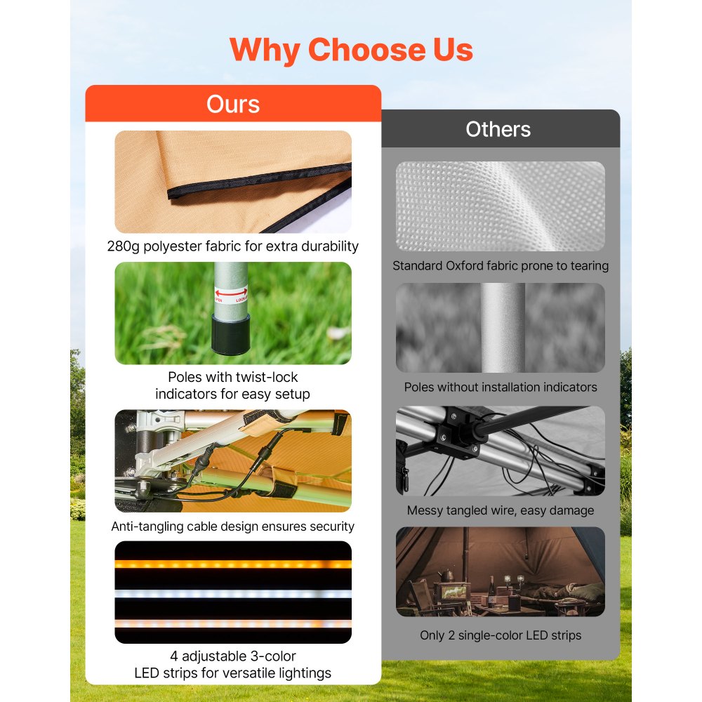 Ευρεία Κάλυψη: Αυτή η τέντα οχήματος προσφέρει θόλο 270° με διαστάσεις 18,7 x 6,4 πόδια, καλύπτοντας 117,33 τετραγωνικά πόδια / 10,9 ㎡ και ύψος 6,89 πόδια - ιδανική για οικογενειακό κάμπινγκ, πικνίκ και υπαίθρια πάρτι. Φωτισμός LED 3 χρωμάτων: Ενσωματωμένες 4 ρυθμιζόμενες λωρίδες LED με εναλλαγή μεταξύ θερμού, λευκού και ψυχρού φωτός με ένα άγγιγμα. Η τέντα 270 μοιρών υποστηρίζει τροφοδοσία αυτοκινήτου 12V ή USB, δημιουργώντας μια ζεστή ατμόσφαιρα για νυχτερινές δραστηριότητες. Σταθερό και ανθεκτικό στις καιρικές συνθήκες: Κατασκευασμένο από ύφασμα πολυεστέρα 280G, αδιάβροχη επίστρωση PU3000mm και προστασία UV50+. Η τέντα μας στο πλάι του αυτοκινήτου με παχύ, ανθεκτικό στη σκουριά πλαίσιο αλουμινίου με πασσάλους και σχοινιά εξασφαλίζει αξιόπιστη σταθερότητα σε αντίξοες καιρικές συνθήκες. Εύκολη εγκατάσταση: Αυτή η τέντα εδάφους για οχήματα διαθέτει αναδιπλούμενη δομή με προεγκατεστημένες κορυφές και στύλους στήριξης που απλοποιούν την εγκατάσταση. Οι λεπτομερείς οδηγίες την καθιστούν φιλική προς τους αρχάριους για εύκολη εγκατάσταση. Υψηλή συμβατότητα: Η τέντα αυτοκινήτου για SUV ταιριάζει σε οχήματα με σχάρες οροφής, εγκάρσιες ράβδους ή πλατφόρμες οροφής, παρέχοντας άφθονο, σταθερό χώρο για κατασκήνωση, πικνίκ, οικογενειακές συγκεντρώσεις ή οδικά ταξίδια.