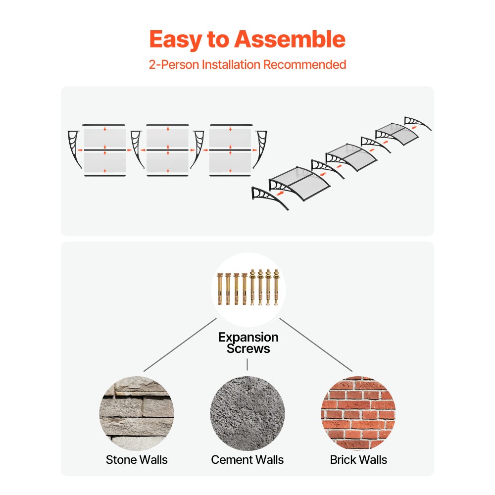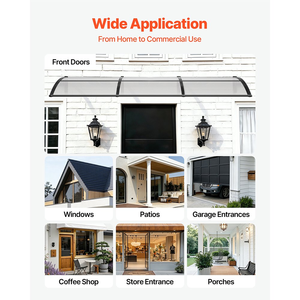 Αποδοτικός Σχεδιασμός Αποστράγγισης: Σχεδιασμένη με αναβαθμισμένο νεροχύτη κατευθυνόμενης αποστράγγισης, αυτή η τέντα πόρτας από πολυανθρακικό απομακρύνει γρήγορα το νερό της βροχής από την είσοδό σας. Από ελαφριές ψιχάλες μέχρι έντονες νεροποντές, διατηρεί την πόρτα σας καθαρή, στεγνή και αντιολισθητική. Προστασία για όλες τις εποχές: Η τέντα παραθύρου μπλοκάρει το έντονο ηλιακό φως, προστατεύει από τη βροχή και το χιόνι και αντέχει στον δυνατό αέρα. Με προστασία UPF 50+, μειώνει τη θερμότητα το καλοκαίρι, παρέχοντας παράλληλα αξιόπιστη κάλυψη τον χειμώνα. Κατάλληλη για μπροστινή πόρτα και βεράντα. Ισχυρή και ανθεκτική κατασκευή: Κατασκευασμένη με πάνελ πολυανθρακικού υψηλής διαφάνειας και ενισχυμένες βάσεις ABS, αυτή η τέντα για είσοδο προσφέρει εξαιρετική αντοχή σε φορτία. Είναι ανθεκτική στους κραδασμούς, επιβραδυντική φλόγας, μειώνει τον θόρυβο και προσθέτει μια καθαρή, μοντέρνα εμφάνιση στο εξωτερικό σας. Γρήγορη εγκατάσταση DIY: Αυτό το εξωτερικό στέγαστρο πόρτας συνοδεύεται από ένα πλήρες κιτ αξεσουάρ, σαφείς οδηγίες εγκατάστασης και δύο τύπους βιδών στερέωσης για τοίχους από τούβλα, σκυρόδεμα ή ξύλο. Εύκολη εγκατάσταση DIY από ένα άτομο. Μετρήστε τον χώρο σας για ιδανική εφαρμογή. Ευέλικτες εφαρμογές: Ιδανικές για μπροστινές πόρτες, παράθυρα, μπαλκόνια και βεράντες, αυτές οι τέντες εξωτερικών θυρών είναι κατάλληλες για σπίτια, καφετέριες και καταστήματα λιανικής. Συσκευασμένες με ασφάλεια για ασφαλή παράδοση και με άμεση εξυπηρέτηση πελατών.