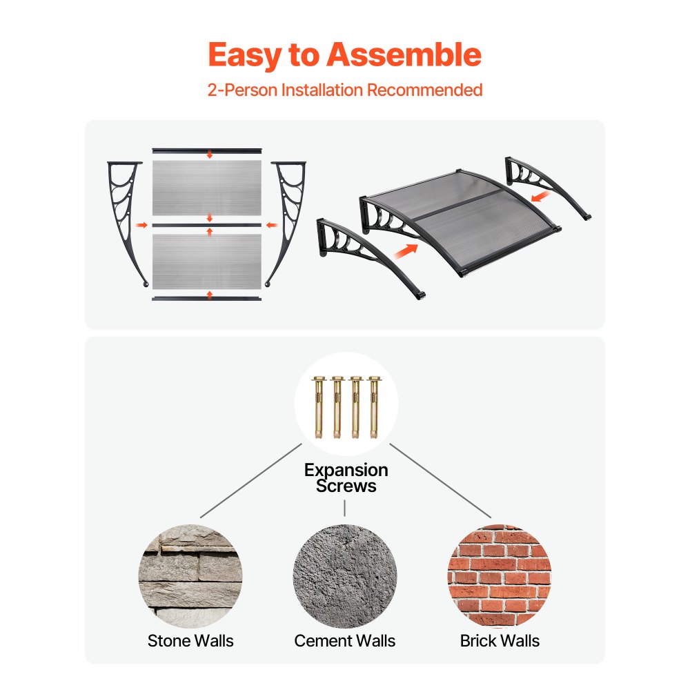 Αποδοτικός Σχεδιασμός Αποστράγγισης: Σχεδιασμένη με αναβαθμισμένο νεροχύτη κατευθυνόμενης αποστράγγισης, αυτή η τέντα πόρτας από πολυανθρακικό απομακρύνει γρήγορα το νερό της βροχής από την είσοδό σας. Από ελαφριές ψιχάλες μέχρι έντονες νεροποντές, διατηρεί την πόρτα σας καθαρή, στεγνή και αντιολισθητική. Προστασία για όλες τις εποχές: Η τέντα παραθύρου μπλοκάρει το έντονο ηλιακό φως, προστατεύει από τη βροχή και το χιόνι και αντέχει στον δυνατό αέρα. Με προστασία UPF 50+, μειώνει τη θερμότητα το καλοκαίρι, παρέχοντας παράλληλα αξιόπιστη κάλυψη τον χειμώνα. Κατάλληλη για μπροστινή πόρτα και βεράντα. Ισχυρή και ανθεκτική κατασκευή: Κατασκευασμένη με πάνελ πολυανθρακικού υψηλής διαφάνειας και ενισχυμένες βάσεις ABS, αυτή η τέντα για είσοδο προσφέρει εξαιρετική αντοχή σε φορτία. Είναι ανθεκτική στους κραδασμούς, επιβραδυντική φλόγας, μειώνει τον θόρυβο και προσθέτει μια καθαρή, μοντέρνα εμφάνιση στο εξωτερικό σας. Γρήγορη εγκατάσταση DIY: Αυτό το εξωτερικό στέγαστρο πόρτας συνοδεύεται από ένα πλήρες κιτ αξεσουάρ, σαφείς οδηγίες εγκατάστασης και δύο τύπους βιδών στερέωσης για τοίχους από τούβλα, σκυρόδεμα ή ξύλο. Εύκολη εγκατάσταση DIY από ένα άτομο. Μετρήστε τον χώρο σας για ιδανική εφαρμογή. Ευέλικτες εφαρμογές: Ιδανικές για μπροστινές πόρτες, παράθυρα, μπαλκόνια και βεράντες, αυτές οι τέντες εξωτερικών θυρών είναι κατάλληλες για σπίτια, καφετέριες και καταστήματα λιανικής. Συσκευασμένες με ασφάλεια για ασφαλή παράδοση και με άμεση εξυπηρέτηση πελατών.