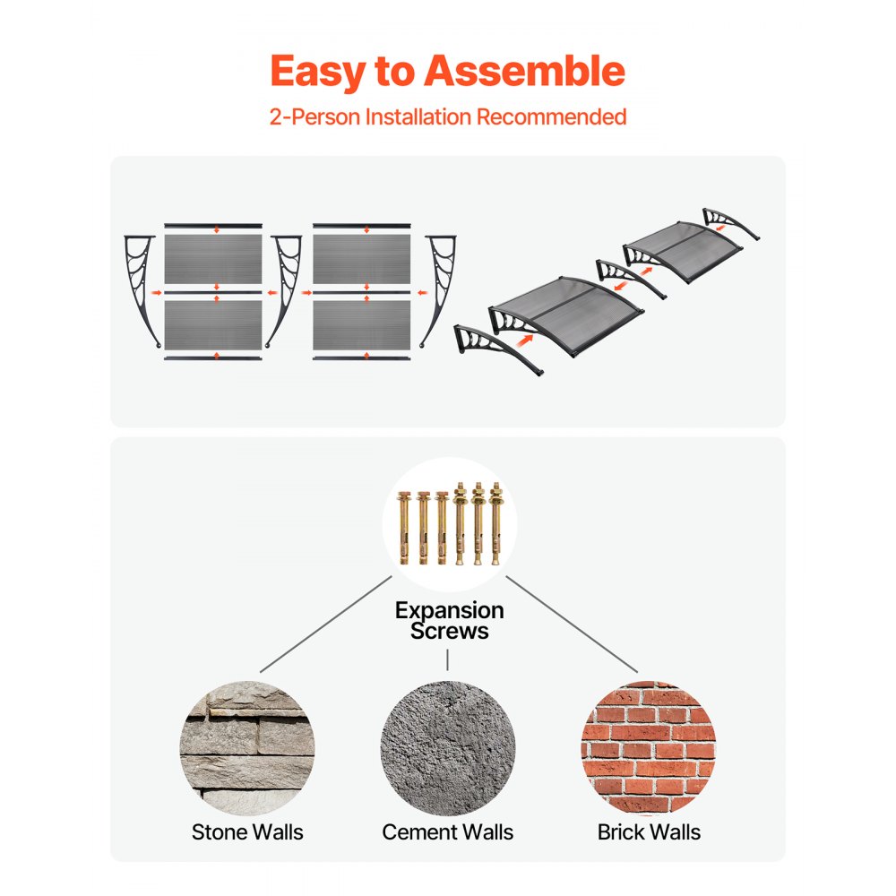 Αποδοτικός Σχεδιασμός Αποστράγγισης: Σχεδιασμένη με αναβαθμισμένο νεροχύτη κατευθυνόμενης αποστράγγισης, αυτή η τέντα πόρτας από πολυανθρακικό απομακρύνει γρήγορα το νερό της βροχής από την είσοδό σας. Από ελαφριές ψιχάλες μέχρι έντονες νεροποντές, διατηρεί την πόρτα σας καθαρή, στεγνή και αντιολισθητική. Προστασία για όλες τις εποχές: Η τέντα παραθύρου μπλοκάρει το έντονο ηλιακό φως, προστατεύει από τη βροχή και το χιόνι και αντέχει στον δυνατό αέρα. Με προστασία UPF 50+, μειώνει τη θερμότητα το καλοκαίρι, παρέχοντας παράλληλα αξιόπιστη κάλυψη τον χειμώνα. Κατάλληλη για μπροστινή πόρτα και βεράντα. Ισχυρή και ανθεκτική κατασκευή: Κατασκευασμένη με πάνελ πολυανθρακικού υψηλής διαφάνειας και ενισχυμένες βάσεις ABS, αυτή η τέντα για είσοδο προσφέρει εξαιρετική αντοχή σε φορτία. Είναι ανθεκτική στους κραδασμούς, επιβραδυντική φλόγας, μειώνει τον θόρυβο και προσθέτει μια καθαρή, μοντέρνα εμφάνιση στο εξωτερικό σας. Γρήγορη εγκατάσταση DIY: Αυτό το εξωτερικό στέγαστρο πόρτας συνοδεύεται από ένα πλήρες κιτ αξεσουάρ, σαφείς οδηγίες εγκατάστασης και δύο τύπους βιδών στερέωσης για τοίχους από τούβλα, σκυρόδεμα ή ξύλο. Εύκολη εγκατάσταση DIY από ένα άτομο. Μετρήστε τον χώρο σας για ιδανική εφαρμογή. Ευέλικτες εφαρμογές: Ιδανικές για μπροστινές πόρτες, παράθυρα, μπαλκόνια και βεράντες, αυτές οι τέντες εξωτερικών θυρών είναι κατάλληλες για σπίτια, καφετέριες και καταστήματα λιανικής. Συσκευασμένες με ασφάλεια για ασφαλή παράδοση και με άμεση εξυπηρέτηση πελατών.