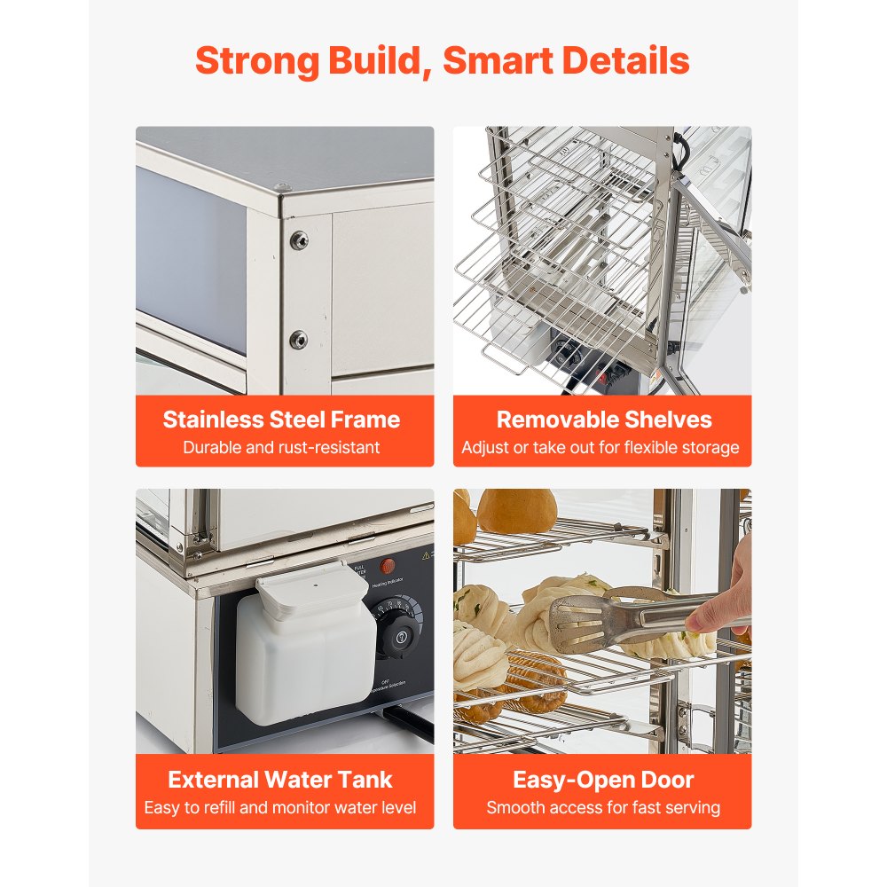 Πολυλειτουργικός σχεδιασμός: Ο θερμαντήρας ατμού συνδυάζει τη θέρμανση, τον ατμό και την επίδειξη σε μία μονάδα για βολική λειτουργία. Σημείωση: Μόνο για ζέσταμα φαγητού, όχι για μαγείρεμα. Μην το χρησιμοποιείτε σε θερμοκρασία άνω των 90°C (194°F) για περισσότερο από 30 λεπτά. Έλεγχος θερμοκρασίας με κουμπί: Ο εύχρηστος διακόπτης επιτρέπει την ακριβή ρύθμιση από 30–110°C, ιδανικός για το ζέσταμα κατεψυγμένων ή φρέσκων ψωμιών, dim sum και άλλων μαγειρεμένων στον ατμό φαγητών, διατηρώντας τα στη βέλτιστη θερμοκρασία σερβιρίσματος οποιαδήποτε στιγμή. Μεγάλη χωρητικότητα 5 στρώσεων: Διαθέτει 5 ευρύχωρα ράφια που μπορούν να χωρέσουν περίπου 50-60 ψωμάκια. Τα αφαιρούμενα ράφια επιτρέπουν την εύκολη πρόσβαση και ο ελαφρώς κεκλιμένος σχεδιασμός εμποδίζει τα σταγονίδια νερού να μουλιάσουν τα ψωμάκια, ιδανικά για τις ώρες αιχμής. Προστασία από ξηρή καύση: Ο ενσωματωμένος αισθητήρας απενεργοποιεί τη μονάδα όταν η στάθμη του νερού είναι χαμηλή, αποφεύγοντας ζημιές και διασφαλίζοντας την ασφαλή λειτουργία. Περιλαμβάνει εσωτερική δεξαμενή (1,7L) και εξωτερική δεξαμενή (πλήρους χωρητικότητας 5L, μέγιστης πλήρωσης 3,5L) για εύκολη διαχείριση του νερού. Ευρείες εφαρμογές: Κατάλληλο για μαγείρεμα στον ατμό ψωμιών, καλαμποκιού, φιστικιών και διαφόρων φαγητών στον ατμό. Ιδανικό για καταστήματα ψιλικών, καταστήματα πρωινού, σνακ μπαρ, ξενοδοχεία και άλλους εμπορικούς χώρους εστίασης.