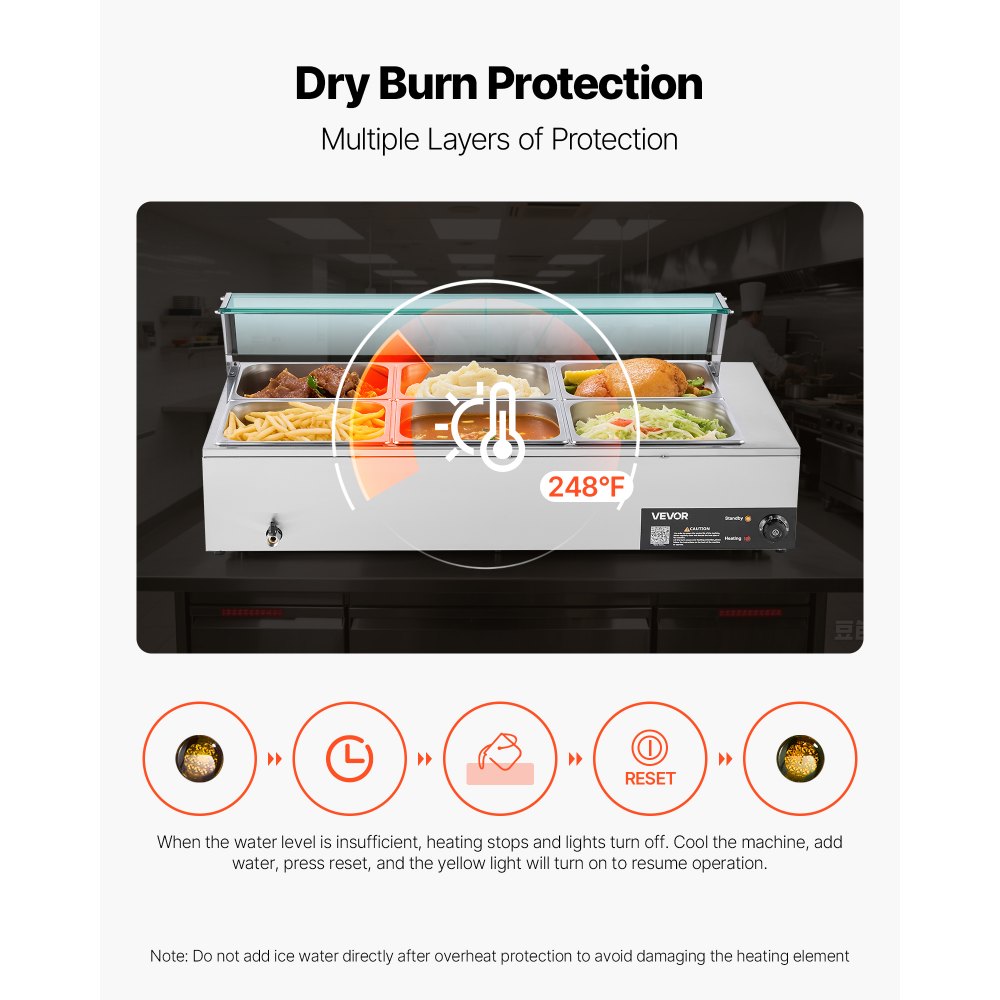 Γρήγορη και ομοιόμορφη θέρμανση: Εξοπλισμένο με έναν ισχυρό σωλήνα θέρμανσης από ανοξείδωτο ατσάλι 1500W, αυτός ο επαγγελματικός θερμαντήρας τροφίμων ζεσταίνει γρήγορα το φαγητό για να διατηρεί τις γεύσεις φρέσκες. Μπορείτε να ρυθμίσετε τη θερμοκρασία από 86–185°F (30-85°C), προσαρμόζοντάς την ώστε να ταιριάζει σε διάφορα πιάτα και ανάγκες σερβιρίσματος. Συνδυασμός μεγάλου χώρου: Με στάνταρ βάθος 5,9, αυτό το μπεν μαρί μπουφέ διαθέτει 6 τηγάνια μεγέθους 1/2 που χωράνε και τα 5,9 σε βαθιά διαμερίσματα. Μπορείτε να τα συνδυάσετε ή να τα ανταλλάξετε εύκολα, δημιουργώντας μενού από σούπες και σάλτσες μέχρι μαγειρευτά, τυρί nachos ή σοκολάτα. Κάλυμμα από διαφανές γυαλί: Το γυάλινο προστατευτικό σε αυτό το τραπέζι ατμού διατηρεί τη θερμότητα έξω και τον δροσερό αέρα μέσα, ενώ παράλληλα δείχνει καθαρά το φαγητό. Η στιβαρή γυάλινη κατασκευή του φαίνεται κομψή και αντέχει στις γρατζουνιές. Τοποθετείται εύκολα με όλα τα εξαρτήματα που περιλαμβάνονται και καθαρίζεται γρήγορα. Μακράς Διάρκειας Κατασκευή: Κατασκευασμένος από ανοξείδωτο ατσάλι, αυτός ο ηλεκτρικός θερμαντήρας τροφίμων προσφέρει σταθερή απόδοση στην οποία μπορείτε να εμπιστευτείτε. Ο σωλήνας θέρμανσης σε σχήμα U από ανοξείδωτο ατσάλι θερμαίνει το φαγητό ομοιόμορφα και διατηρεί την άψογη λειτουργία του ακόμα και μετά από επαναλαμβανόμενη χρήση. Λειτουργία Έξυπνης Διακοπής: Όταν η θερμοκρασία ξεπεράσει τους 120°C, ο θερμαντήρας τροφίμων σταματά να θερμαίνεται μόνος του. Για να τον χρησιμοποιήσετε ξανά, ξαναγεμίστε με νερό και πατήστε το κουμπί επαναφοράς. Αποφύγετε να ρίχνετε παγωμένο νερό, καθώς μπορεί να προκαλέσει ζημιά στον σωλήνα θέρμανσης.