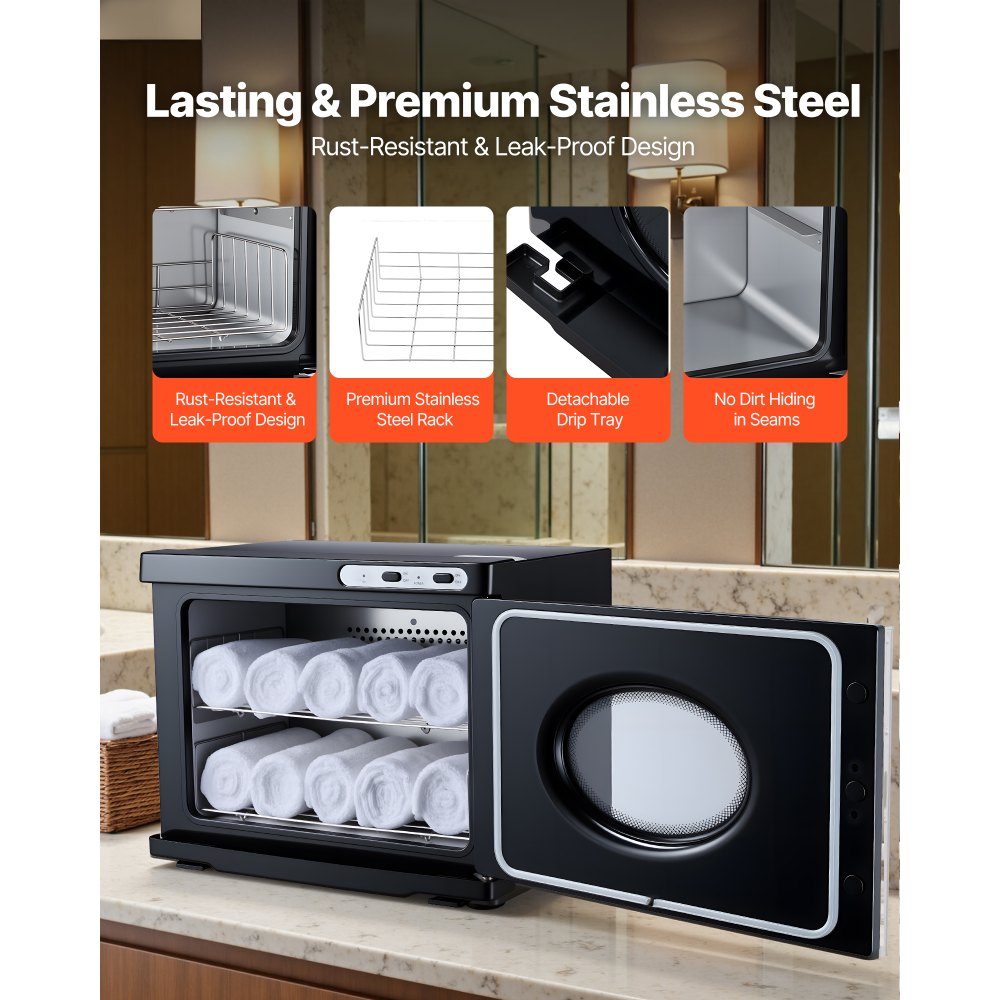 Αποτελεσματική απολύμανση: Αυτή η θερμάστρα για πετσέτες διαθέτει λειτουργία θέρμανσης με ατμό (θερμαίνεται γρήγορα έως 80°C σε 5 λεπτά), με καθαρή απολύμανση με λάμπα για βαθύ καθαρισμό. Η θέρμανση με θερμική ακτινοβολία 360° εξασφαλίζει ομοιόμορφη θέρμανση χωρίς νεκρές γωνίες. Διάφορες επιλογές χωρητικότητας: Παρέχοντας διαφορετικές χωρητικότητες (5-46 L), η θήκη θέρμανσης πετσετών μας καλύπτει τις ανάγκες αποθήκευσης διαφορετικών χρηστών. Είτε για οικιακή χρήση είτε για εμπορικούς χώρους, μπορείτε να βρείτε ένα κατάλληλο μοντέλο που χωράει εύκολα την απαιτούμενη χωρητικότητα. Εύκολη και αξιόπιστη λειτουργία: Το ντουλάπι ζεστών πετσετών διαθέτει έναν απλό διακόπτη ή μηχανικό κουμπί ελέγχου. Εξοπλισμένο με συσκευή προστασίας από υπερθέρμανση, απενεργοποιείται αυτόματα σε περίπτωση μη φυσιολογικής θερμοκρασίας και ο παχύς δακτύλιος στεγανοποίησης αποτρέπει τη διαρροή νερού. Ανθεκτικό και υψηλής ποιότητας υλικό: Τα βασικά μέρη του θερμαντήρα πετσετών μας είναι κατασκευασμένα από ανοξείδωτο ατσάλι και κράμα αλουμινίου (ανθεκτικό στη θερμότητα και τη σκουριά). Διαθέτει αποσπώμενο δίσκο συλλογής υγρών για εύκολο καθάρισμα και ο διπλός θερμοστάτης αποτρέπει τη ζημιά στα εξαρτήματα, παρατείνοντας τη διάρκεια ζωής τους. Ευρείες εφαρμογές: Είτε σε μπάνιο σπιτιού, κομμωτήριο ή ξενοδοχείο, αυτή η θερμάστρα πετσετών είναι ιδανική. Το διαφανές γυάλινο παράθυρό της επιτρέπει την ορατότητα των υπόλοιπων πετσετών και την εύκολη πρόσβαση, καλύπτοντας τις διάφορες ανάγκες.