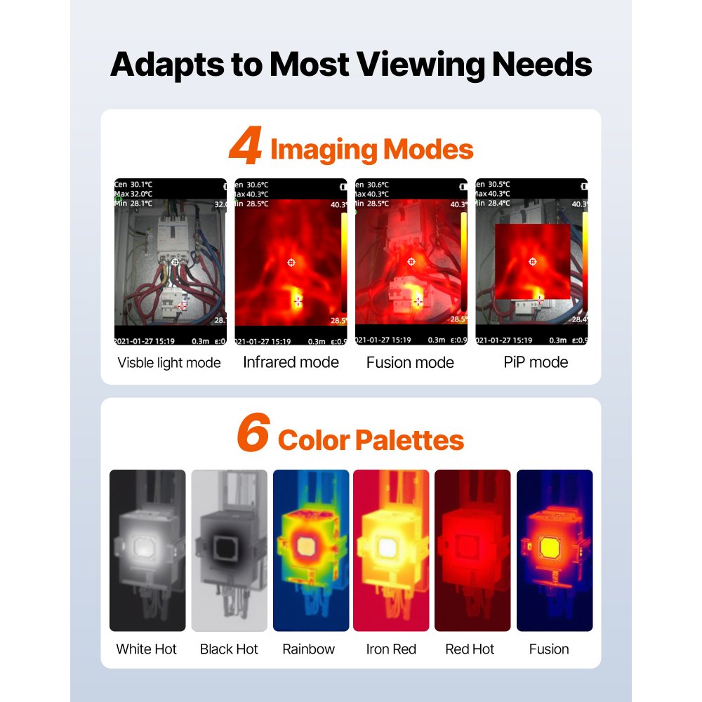 Τεχνολογία Βελτίωσης Εικόνας: Η θερμική απεικόνιση VEVOR υιοθετεί τεχνολογία βελτίωσης TISR, αναβαθμίζοντας την αρχική ανάλυση IR των 96x96 σε υπερ-ανάλυση 240x180. Με ρυθμό ανανέωσης 25Hz, θερμική ευαισθησία ≤60 mK και ευρύ οπτικό πεδίο 50,0°(H)x50°(V) /72,1°(D), σε συνδυασμό με αλγόριθμους ευκρίνειας εικόνας και ένα τσιπ τεχνητής νοημοσύνης υψηλής απόδοσης, η οθόνη LCD 2,4 ιντσών καταγράφει και εμφανίζει λεπτομέρειες θερμότητας με μεγαλύτερη ευκρίνεια. Ακριβής μέτρηση θερμοκρασίας: Αυτή η κάμερα υπερύθρων υποστηρίζει ένα ευρύ φάσμα θερμοκρασιών από -20℃ έως 550℃ / -4°F έως 1022°F. Παρακολουθεί αυτόματα θερμά και ψυχρά σημεία και εμφανίζει δεδομένα κεντρικής, μέγιστης και ελάχιστης θερμοκρασίας. Με 4 λειτουργίες θερμικού χρώματος και 6 επιλογές παλέτας, προσαρμόζεται σε διαφορετικές ανάγκες εργασίας, παρέχοντας πιο εύχρηστη και ευκρινέστερη απεικόνιση. Γρήγορη ανίχνευση σφαλμάτων: Η υπέρυθρη θερμική απεικόνιση μας διαθέτει ενσωματωμένους συναγερμούς υψηλής/χαμηλής θερμοκρασίας για την αυτόματη παρακολούθηση των αποκλίσεων και την άμεση έκδοση ειδοποιήσεων. Σας βοηθά να εντοπίζετε γρήγορα ζώνες υπερθέρμανσης ή χαμηλής θερμοκρασίας, να εντοπίζετε με ακρίβεια σφάλματα και να ανιχνεύετε κρυφούς κινδύνους θερμότητας, καθιστώντας τα πιθανά προβλήματα σαφώς ορατά για έγκαιρη δράση. Πολλαπλές αναβαθμίσεις: Αυτή η θερμική κάμερα είναι εξοπλισμένη με μπαταρία υψηλής χωρητικότητας 3200mAh που παρέχει έως και 7 ώρες λειτουργίας. Υποστηρίζει αυτόματη απενεργοποίηση, εγγραφή φωτογραφιών και βίντεο και φωτισμό LED. Το ελαφρύ αλλά στιβαρό σώμα αντέχει σε πτώσεις από ύψος έως και 1,5 m και, με προστασία IP54 από σκόνη και νερό, είναι έτοιμη για απαιτητικά περιβάλλοντα. Ευρείες εφαρμογές: Η θερμική μας κάμερα απεικόνισης υποστηρίζει φόρτιση USB για ευκολία και διαθέτει ενσωματωμένη αποθήκευση 8GB, ικανή να αποθηκεύσει πάνω από 30.000 εικόνες. Υποστηρίζει 10 ρυθμίσεις γλώσσας και είναι ευρέως εφαρμόσιμη για επιθεώρηση πλακέτας κυκλωμάτων, αντιμετώπιση προβλημάτων HVAC, ηλεκτρικούς ελέγχους, διαγνωστικά κτιρίων, συντήρηση οχημάτων και βιομηχανική ανίχνευση.