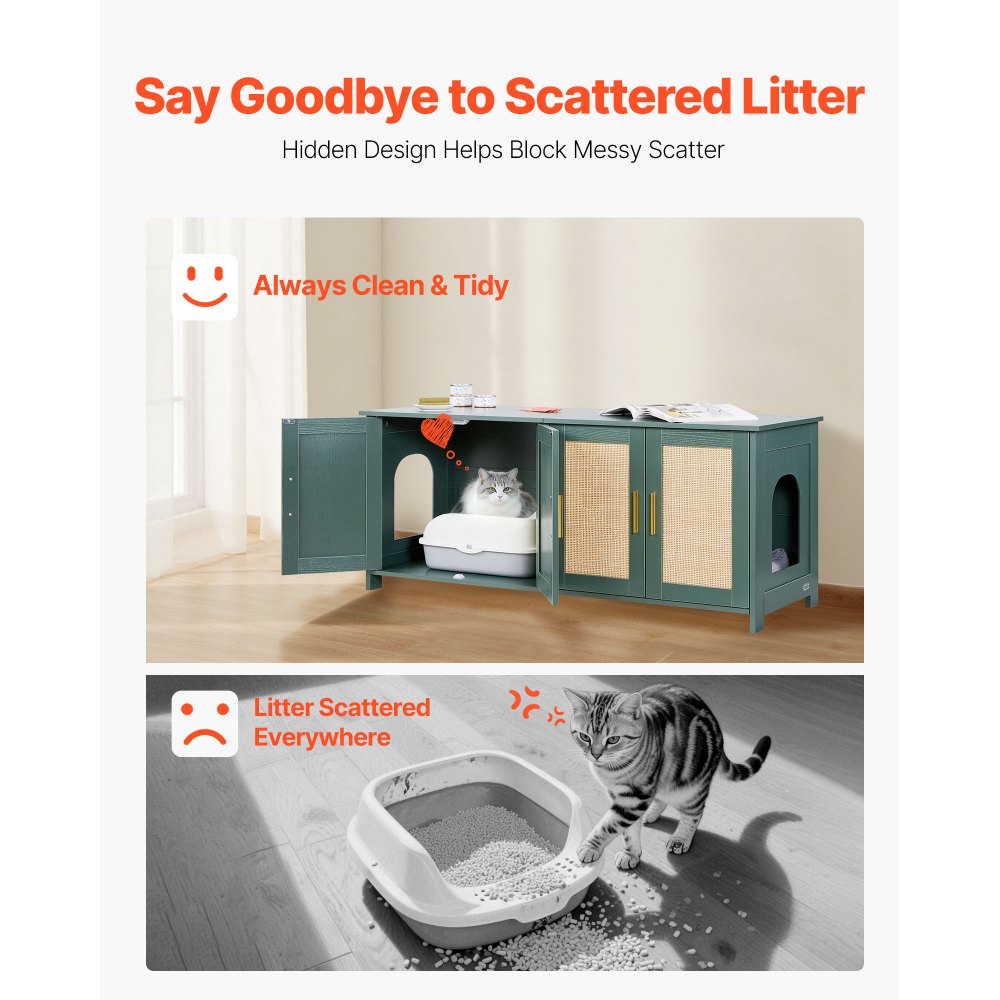 Ευρύχωρος σχεδιασμός πολλαπλής εισόδου: Με διαστάσεις 47,24 × 17,72 × 19,69 ίντσες, αυτός ο ξύλινος θάλαμος άμμου προσφέρει άφθονο χώρο με 4 πόρτες και 2 περάσματα για γάτες για εύκολη πρόσβαση. Ιδανικός για νοικοκυριά με πολλές γάτες, βοηθά στη μείωση των εδαφικών διαφορών και παρέχει μια πιο άνετη, προσαρμόσιμη εμπειρία αμμολεκάνης. Ανθεκτική και σταθερή δομή: Κατασκευασμένο από μοριοσανίδα 12 mm και MDF 15 mm για επιπλέον πάχος, αυτό το έπιπλο άμμου άμμου υποστηρίζει έως και 132,28 λίβρες στην κορυφή και 99,20 λίβρες στη βάση. Το φινίρισμα μελαμίνης είναι ανθεκτικό στο νερό και τις γρατσουνιές για ευκολότερο καθημερινό καθάρισμα. Ανθεκτική σε ζημιές κατασκευή: Αυτό το κρυφό περίβλημα για αμμοδόχο διαθέτει σχεδιασμό με τμηματικά πάνελ για ασφαλέστερη μεταφορά, μειώνοντας τον κίνδυνο θραύσης της σανίδας. Αυτός ο σχεδιασμός ελαχιστοποιεί τις γρατσουνιές, τα βαθουλώματα και τις ρωγμές, βελτιώνοντας την εμπειρία αποσυσκευασίας και μειώνοντας τις επιστροφές. Έλεγχος οσμών σε κλειστό χώρο: Το κλείσιμο με διπλή πόρτα και ανεξάρτητα πλευρικά παράθυρα εξαερισμού διατηρεί την άμμο της άμμου περιορισμένη και τις οσμές μειωμένες, προσφέροντας παράλληλα στις γάτες έναν ιδιωτικό χώρο χωρίς άγχος. Το ντουλάπι της άμμου διαθέτει πάνελ πόρτας σε στυλ μπαστούνι που εξασφαλίζουν ροή αέρα χωρίς να παγιδεύουν μυρωδιές μούχλας. Κομψό & Πολυλειτουργικό: Το περίβλημα άμμου υγιεινής για γάτες μας με το κομψό πράσινο σώμα, τα πάνελ πόρτας από ρατάν και τις χρυσές αλουμινένιες λαβές, το καθιστούν vintage και κομψό. Το στιβαρό και ανθεκτικό πάνω μέρος μπορεί να χρησιμοποιηθεί και ως κρεβάτι γάτας, ντουλάπι αποθήκευσης ή βοηθητικό τραπεζάκι. Ένα περίβλημα άμμου υγιεινής, συνδυάζεται άψογα με διάφορα στυλ διακόσμησης σπιτιού, εξοικονομώντας παράλληλα χώρο.