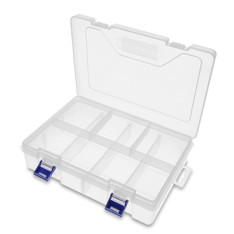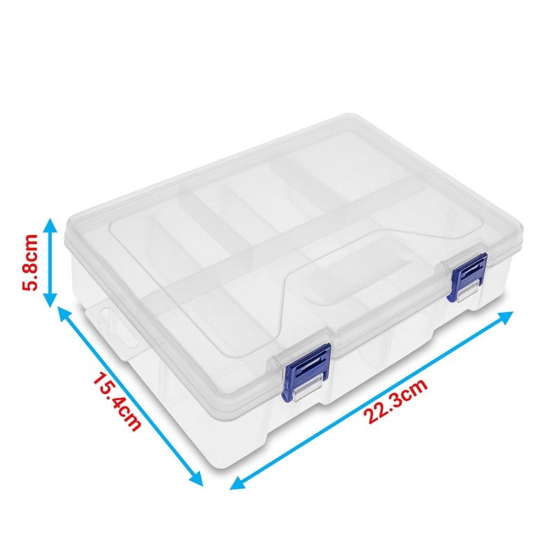 Πλαστικό κουτί οργάνωσης και αποθήκευσης, με 5-8 θέσεις. Με διάφανο καπάκι για εύκολη αναγνώριση του περιεχομένου.Πρακτικός τρόπος κλεισίματος που σφραγίζει με κλιπ. Ελαφριά, φορητή και πρακτική κατασκευή.Ιδανική για αποθήκευση μικρών πραγμάτων και εξαρτημάτων.Κατάλληλο για κάθε εργαστήριο τεχνικών Η/Υ αλλά και για λάτρεις του DIY. Χαρακτηριστικά: Υλικό: IP 67 Θέσεις : 5-8 Χρώμα: Διάφανο Διαστάσεις Θέσεων: 153x 53 x 35mm / 73 x 73 x 18mm / 74 x 218 x 18mm Εξωτερικές διαστάσεις : 230 x 163 x 60mm DOA 14 Ημερών