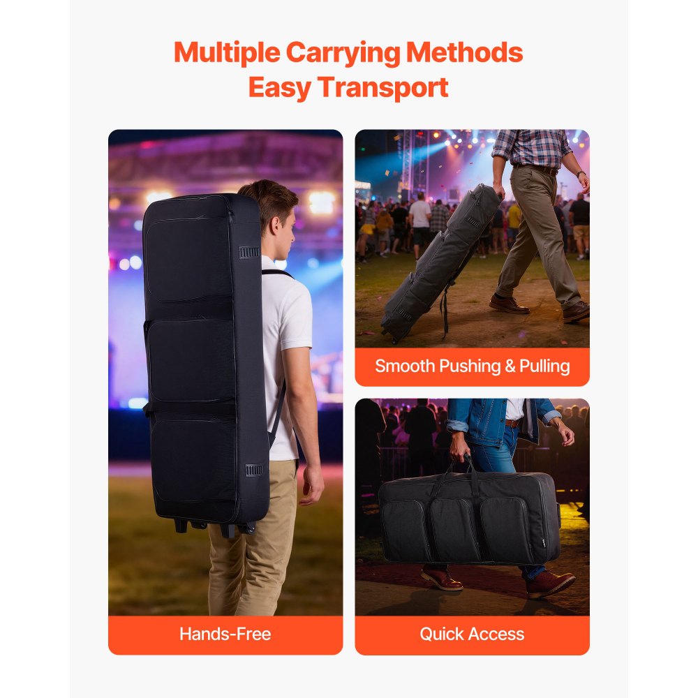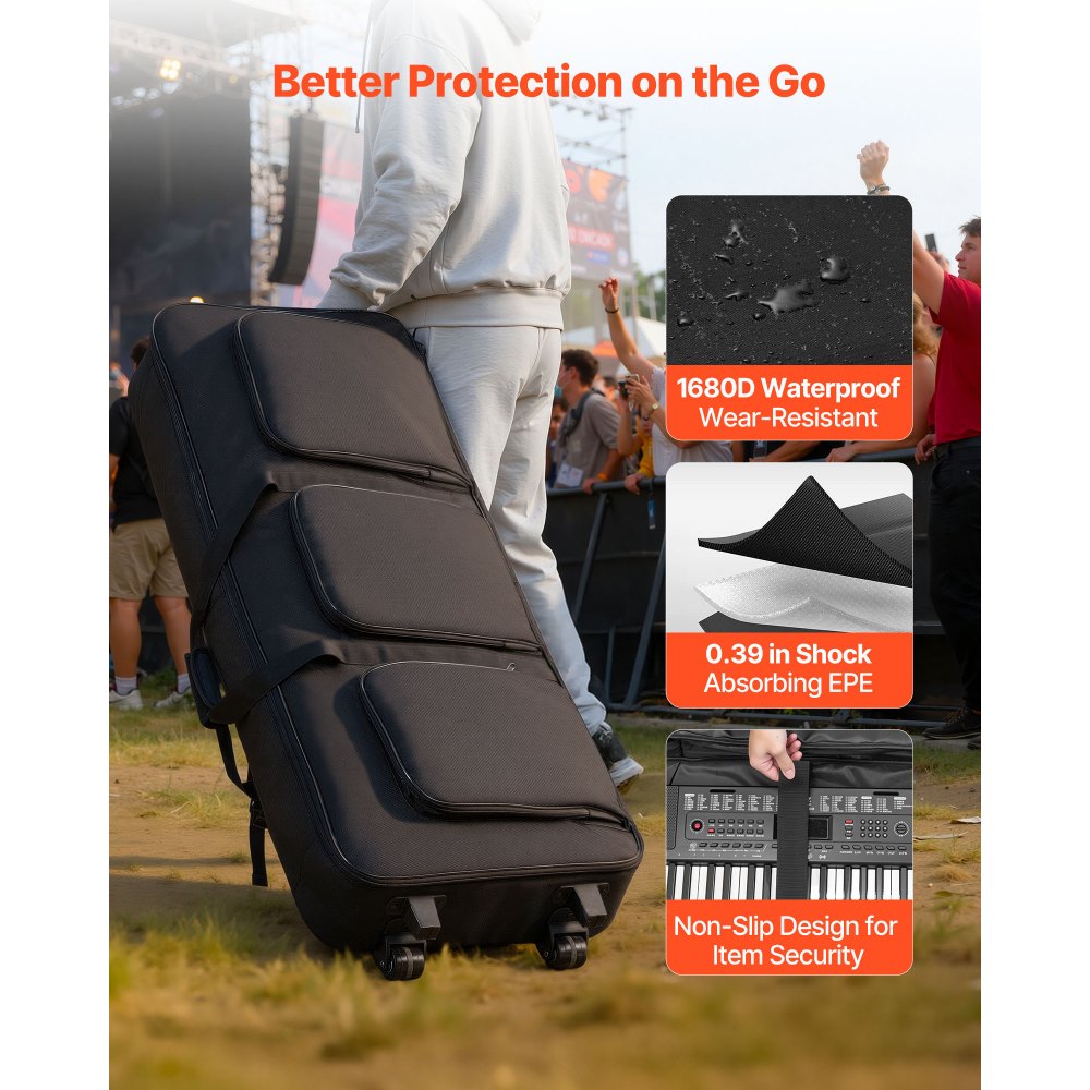 Ευρύχωρος χώρος: Αυτή η θήκη πληκτρολογίου 88 πλήκτρων διαθέτει εσωτερικό μέγεθος 40,9 x 16,9 x 5,1 ίντσες, το οποίο μπορεί να χωρέσει πιάνα 88 πλήκτρων, 61 πλήκτρων, 49 πλήκτρων, πληκτρολόγια MIDI, λεπτά χειριστήρια, πετάλια, προσαρμογείς κ.λπ. Ελέγξτε τις διαστάσεις του πληκτρολογίου σας πριν από την αγορά. Πολλαπλή προστασία: Κατασκευασμένη από υλικό ανθεκτικό στις γρατσουνιές και τη φθορά, η κυλιόμενη θήκη πληκτρολογίου εξασφαλίζει ανθεκτικότητα. Με πυκνό βαμβάκι EPE και τρεις εσωτερικούς ιμάντες στερέωσης, απορροφά τους κραδασμούς και τα προστατευτικά, προστατεύοντας το πληκτρολόγιό σας από γρατσουνιές και χτυπήματα. Σχεδιασμός με πολλαπλές τσέπες: Με πολλαπλές τσέπες, η τσάντα πληκτροφόρων 88 πλήκτρων μας μπορεί να αποθηκεύσει μικρά αντικείμενα, όπως βάσεις μουσικής, παρτιτούρες, πετάλια και καλώδια. Σας επιτρέπει να αποθηκεύετε αντικείμενα με τάξη και να τα διατηρείτε όλα οργανωμένα για γρήγορη και εύκολη πρόσβαση. Ευέλικτες επιλογές μεταφοράς: Η τσάντα 88 πλήκτρων για πληκτρολόγιο παρέχει 3 τρόπους μεταφοράς για μουσικούς και ταξιδιώτες. Οι κάτω ρόδες κάνουν το κύλισμα πανεύκολο, η λαβή είναι ιδανική για γρήγορο πιασίμα και το σακίδιο πλάτης επιτρέπει τη μεταφορά χωρίς χέρια. Μακροχρόνια αξιοπιστία: Η κυλιόμενη θήκη πιάνου έχει σχεδιαστεί με ενισχυμένες ραφές για βελτιωμένη αντοχή στις ραφές για μακροχρόνια χρήση. Το ανθεκτικό φερμουάρ διατηρεί τον εξοπλισμό σας ασφαλή και αντιστέκεται στο σκίσιμο ή την ολίσθηση, ακόμη και υπό έντονο τράβηγμα.
