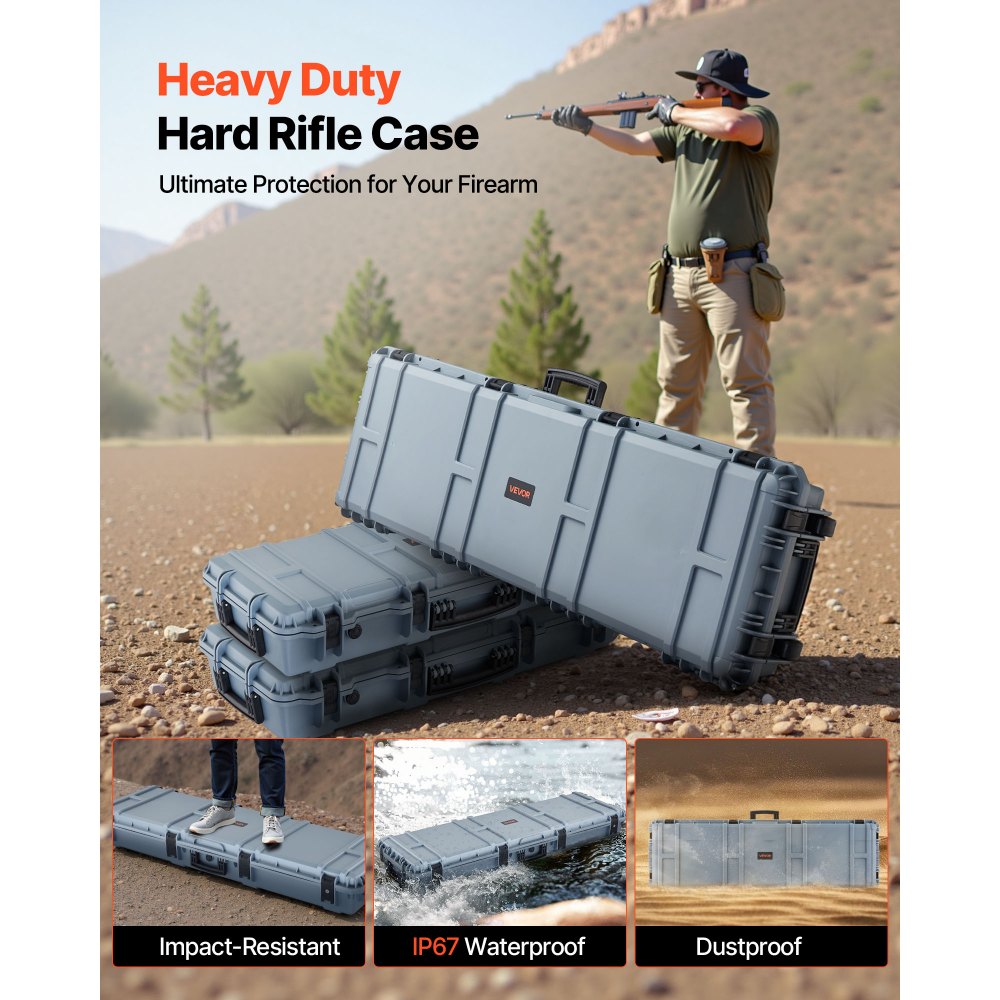 IP67 Αδιάβροχη και ανθεκτική στη σκόνη: Αυτή η σκληρή θήκη τουφέκι διαθέτει ένα ανθεκτικό, ανθεκτικό στις κρούσεις εξωτερικό με προστασία IP67 για το νερό και τη σκόνη, εξασφαλίζοντας έναν πλήρως σφραγισμένο σχεδιασμό που κρατά το νερό έξω. Προστατεύει τα όπλα σας από τις σκληρές καιρικές συνθήκες. Συμμορφώνεται με τα πρότυπα TSA: Αυτή η θήκη τουφέκι πληροί τα πρότυπα της TSA και είναι κατάλληλη για ταξίδια σε αεροπλάνα, τρένα και άλλα μέσα μεταφοράς. Εξοπλισμένη με πολλαπλά μάνδαλα, μπορείτε επίσης να προσθέσετε λουκέτα στις ενσωματωμένες οπές κλειδαριάς για επιπλέον ασφάλεια (Σημείωση: τα λουκέτα δεν περιλαμβάνονται) Αφρός 4 στρώσεων: Η θήκη του όπλου μας διαθέτει 4 στρώσεις μαλακού αφρού: 1 στρώση αφρού τύπου αυγοθήκης για απορρόφηση κραδασμών, 2 στρώσεις προκομμένου αφρού για άνετη εφαρμογή, 1 στρώση συμπαγούς αφρού για επιπλέον στήριξη. Μπορείτε να προσαρμόσετε τις θήκες στα σχήματα του τουφέκι σας. Μακράς Διάρκειας: Κατασκευασμένη με μεταλλικούς μεντεσέδες, αυτή η θήκη είναι πιο ανθεκτική στη φθορά από τις πλαστικές εναλλακτικές. Αντέχει στο επαναλαμβανόμενο άνοιγμα και κλείσιμο χωρίς συμβιβασμούς. Η θήκη διαθέτει βαλβίδα εξισορρόπησης πίεσης για τη ρύθμιση και την εξισορρόπηση της εσωτερικής πίεσης αέρα. Φορητή και εύκολη στη μετακίνηση: Εξοπλισμένη με δύο αθόρυβους τροχούς, αυτή η σκληρή θήκη όπλου μπορεί να μεταφερθεί αβίαστα σε δημόσιους χώρους, ελαχιστοποιώντας την αναστάτωση. Οι πολλαπλές εργονομικές λαβές κάνουν την ανύψωση και τη μεταφορά απλή, προσφέροντας μέγιστη ευελιξία και ευκολία.
